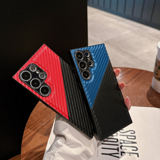 Business contrast color carbon fiber leather grain metal lens drop-proof mobile phone case