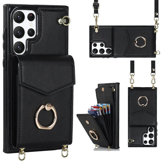 Crossbody Lanyard Ring Wrist Strap Card Holder Leather Case for Samsung