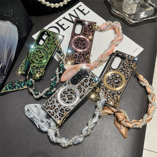 Suitable for Samsung zfold mobile phone case leopard print magnetic rhinestone creative folding protective cover