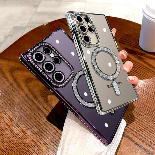 Magnetische Schutzhülle für Samsung mit Glitzer-Strasssteinen, Ständer und Kosmetikspiegel