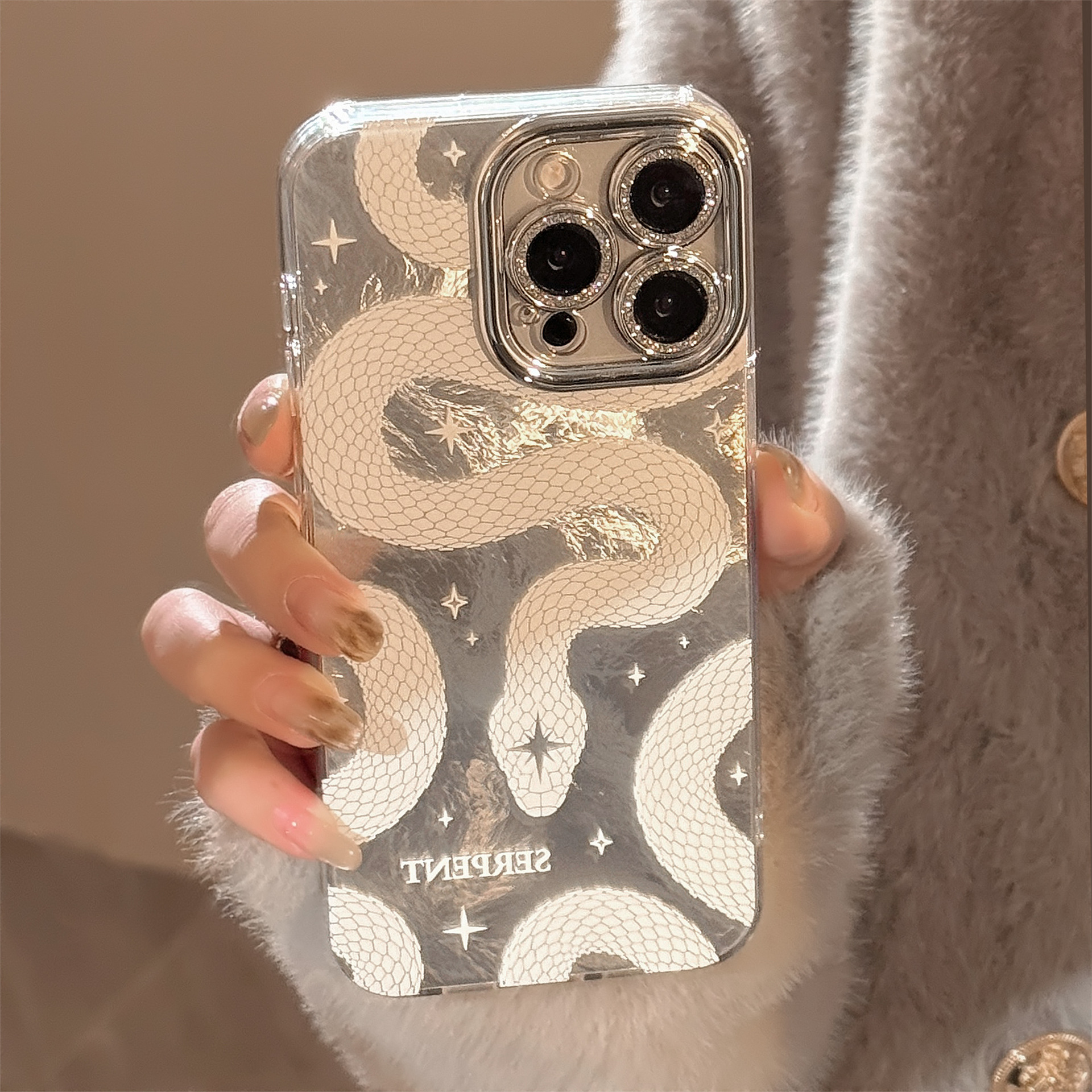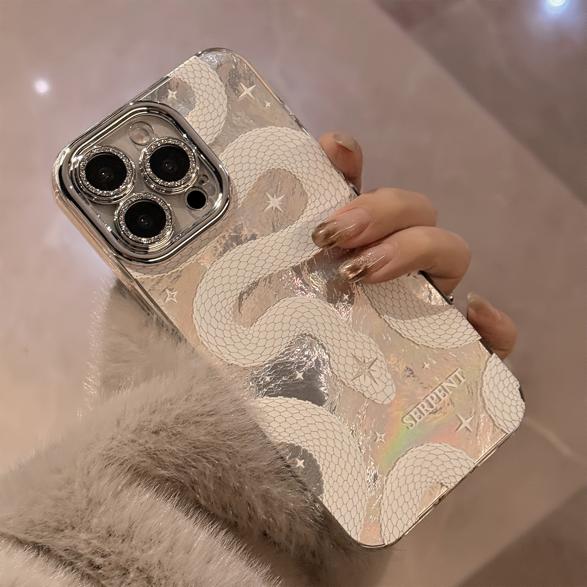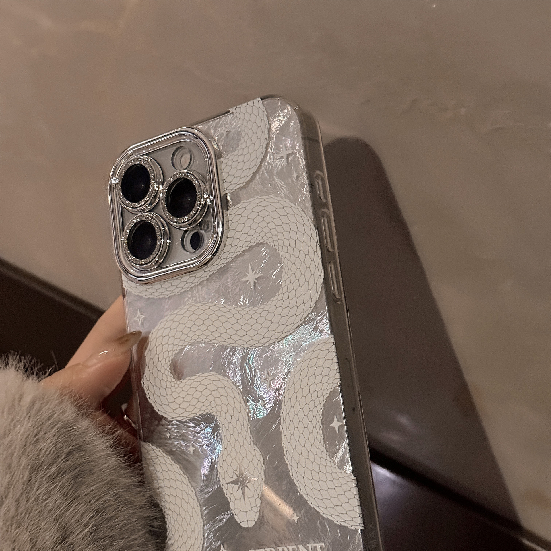2025 White Python Pattern Phone Case For iPhone Lens Glitter
