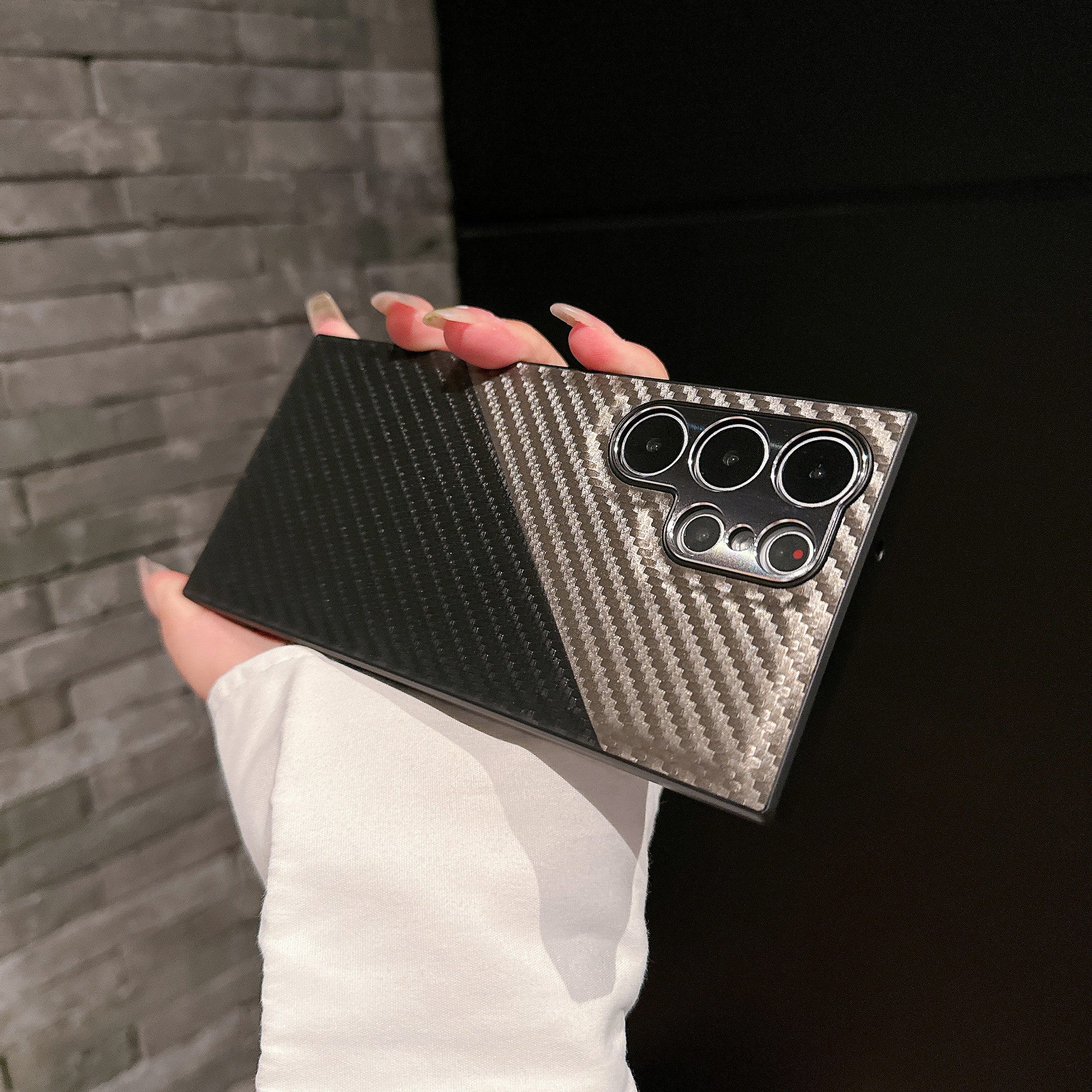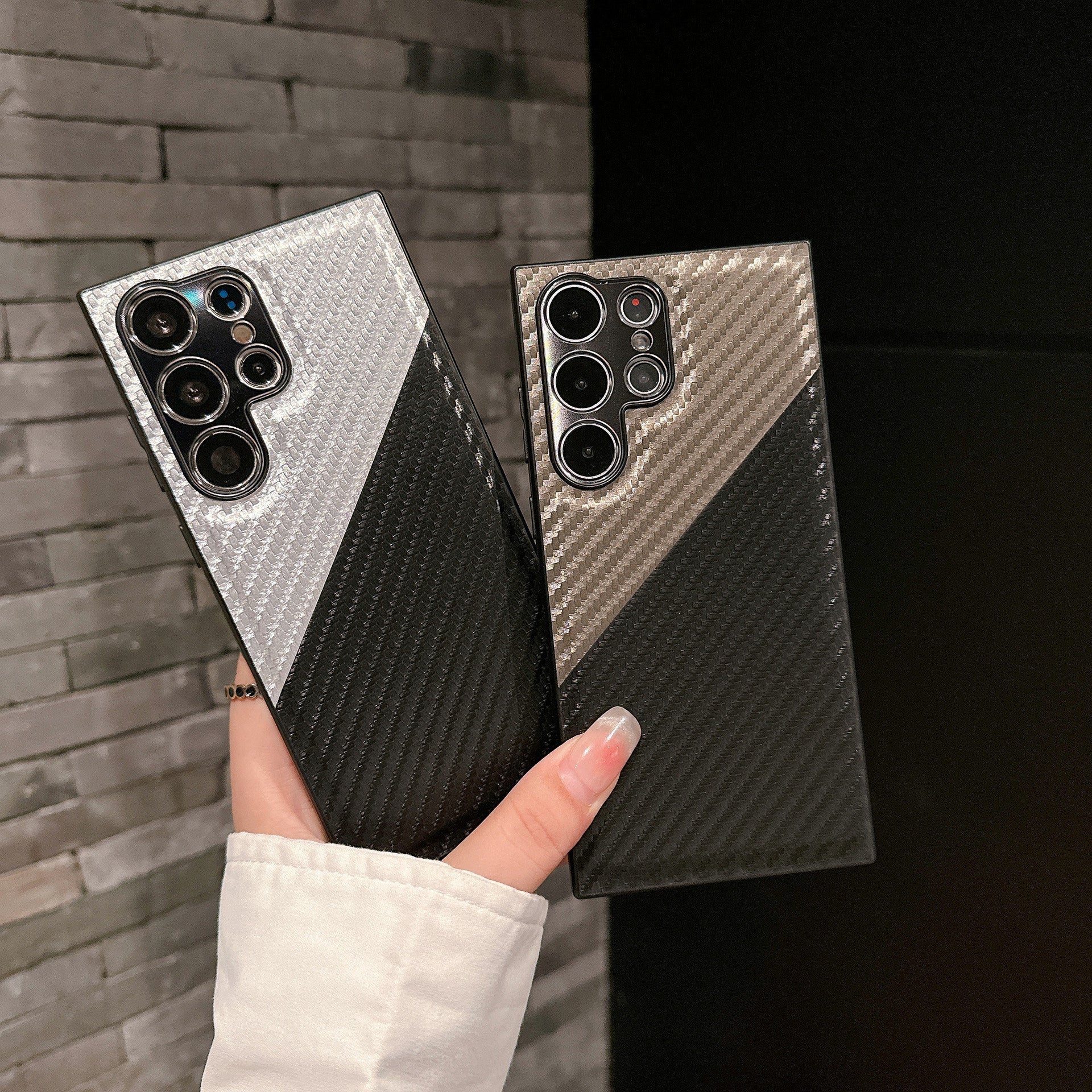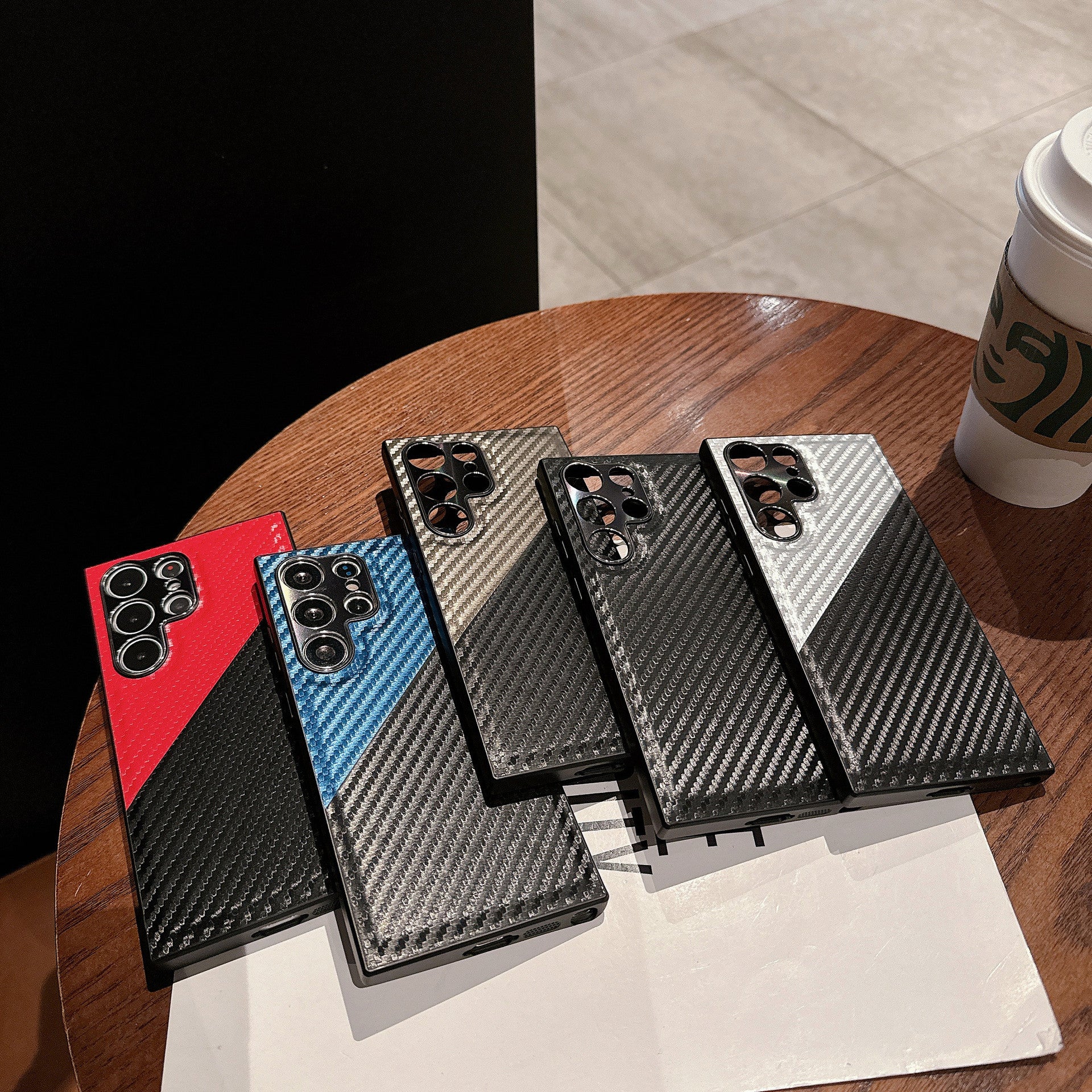 Business contrast color carbon fiber leather grain metal lens drop-proof mobile phone case