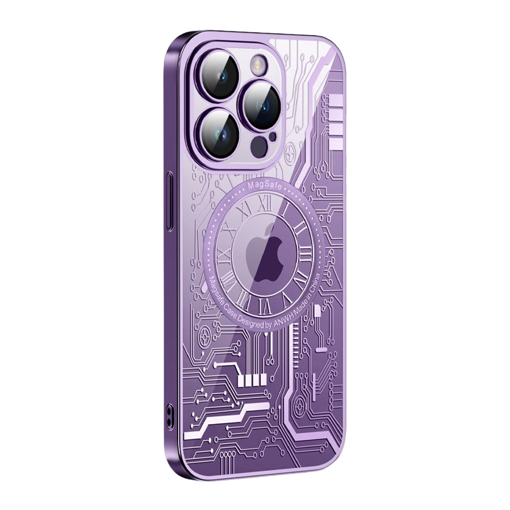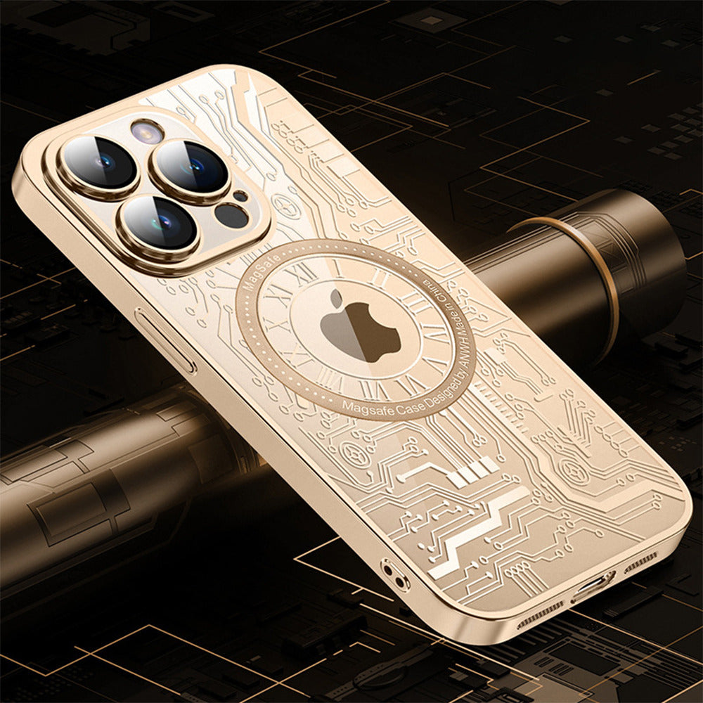 This iPhone MagSafe Series Cyborg Mechanical Clear Case features embossed hot stamping process, the pattern is not easy to peel off. On the surface, it is coated with anti-scratch coating inside and out. All materials and coatings are optimized to prevent yellowing over time. Built-in magnets in this case align perfectly with your iPhone for a magical connection experience and faster wireless charging every time. To charge, simply leave the case on your iPhone and snap on the MagSafe charger.