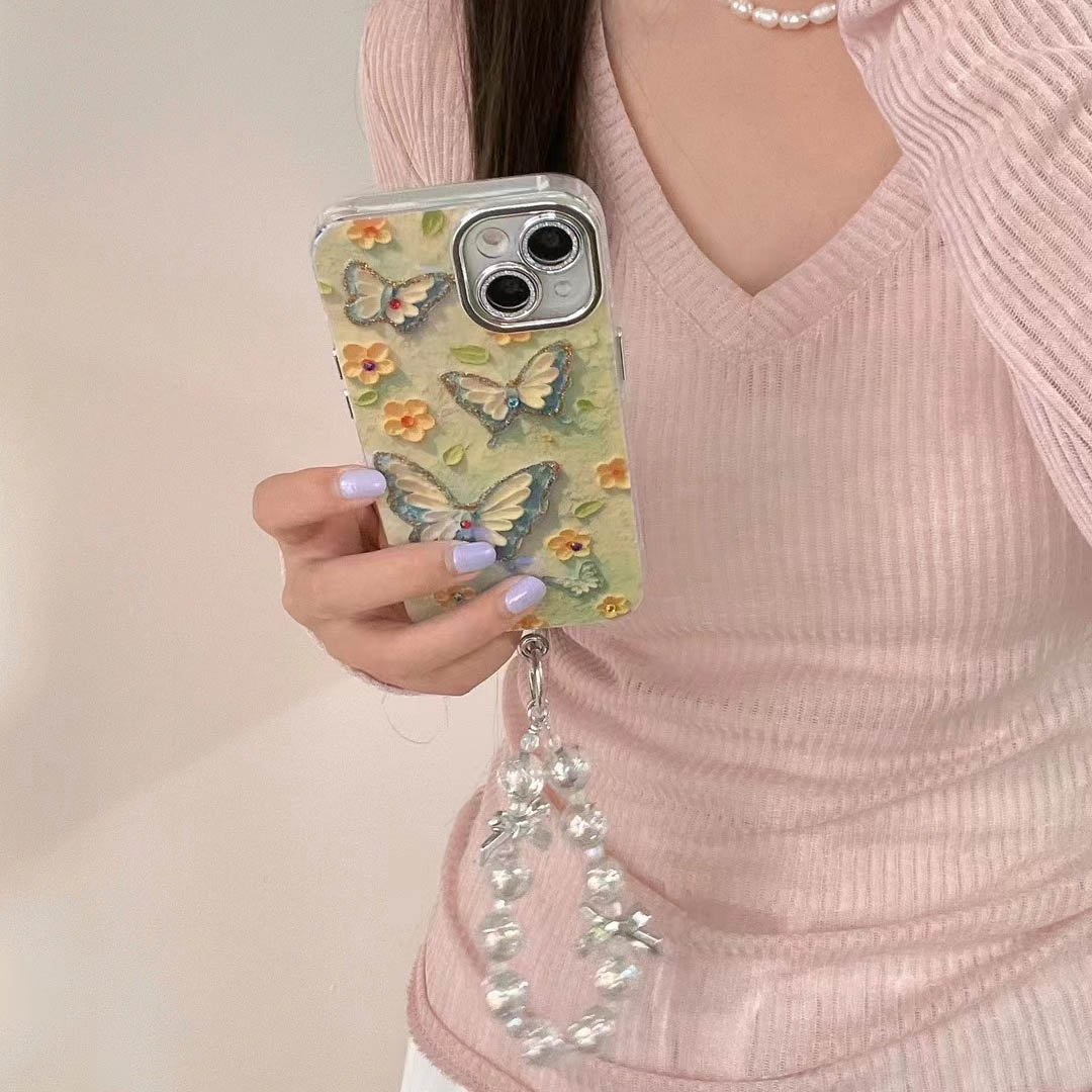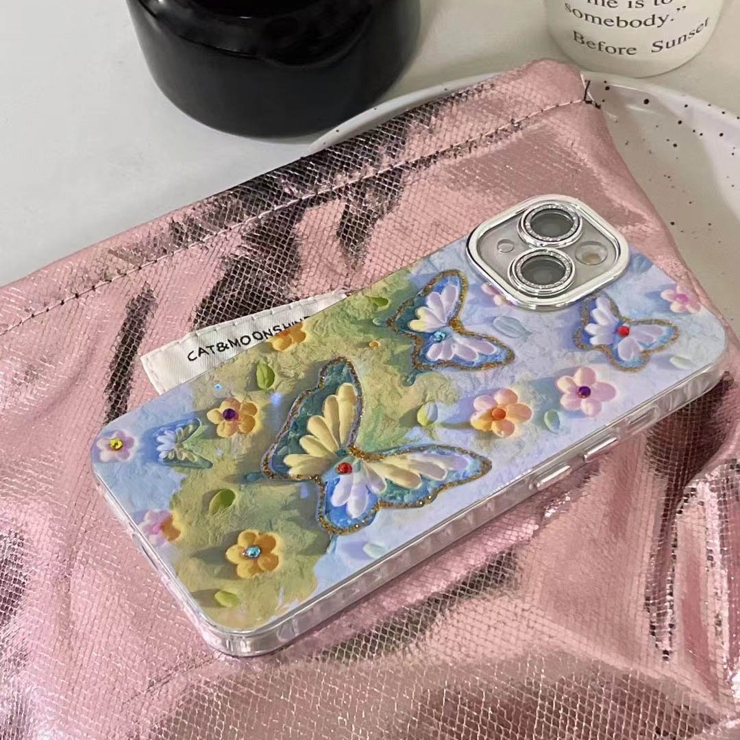 Dots Drill Oil Painting Flower Butterfly Phone Case for iPhone 15