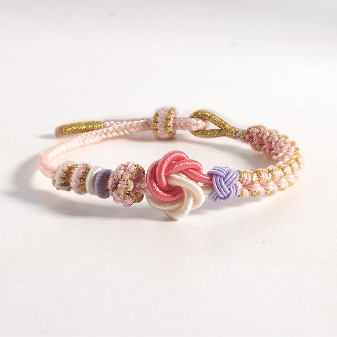 The Peach Blossom Knot bracelet is delicately crafted from intertwining threads, one a tender pink, the other a pure white. The pink strand embodies the spirit of a cherished grandmother, while the white thread embodies the grace of a beloved granddaughter. These threads entwine, much like the unbreakable bond between generations, where grandmother and granddaughter find solace in each other's embrace.