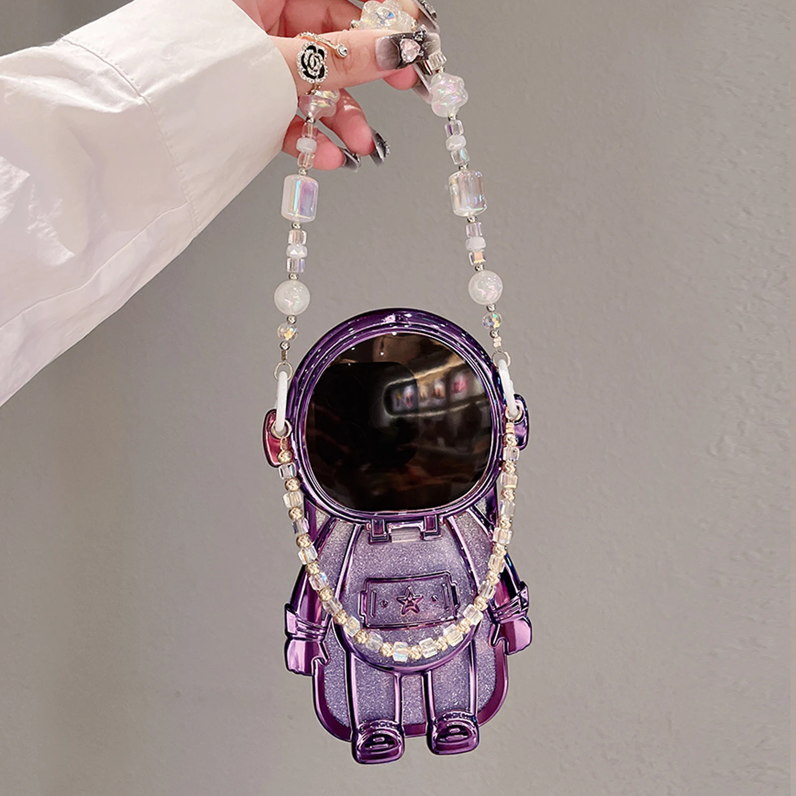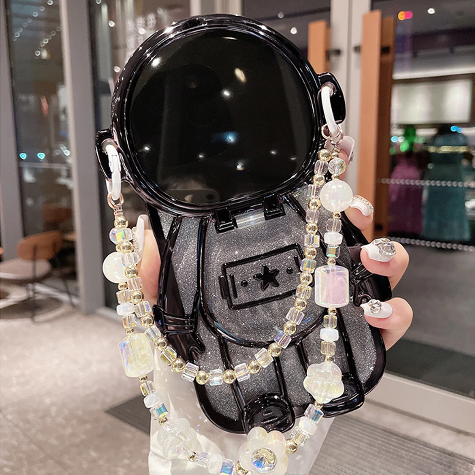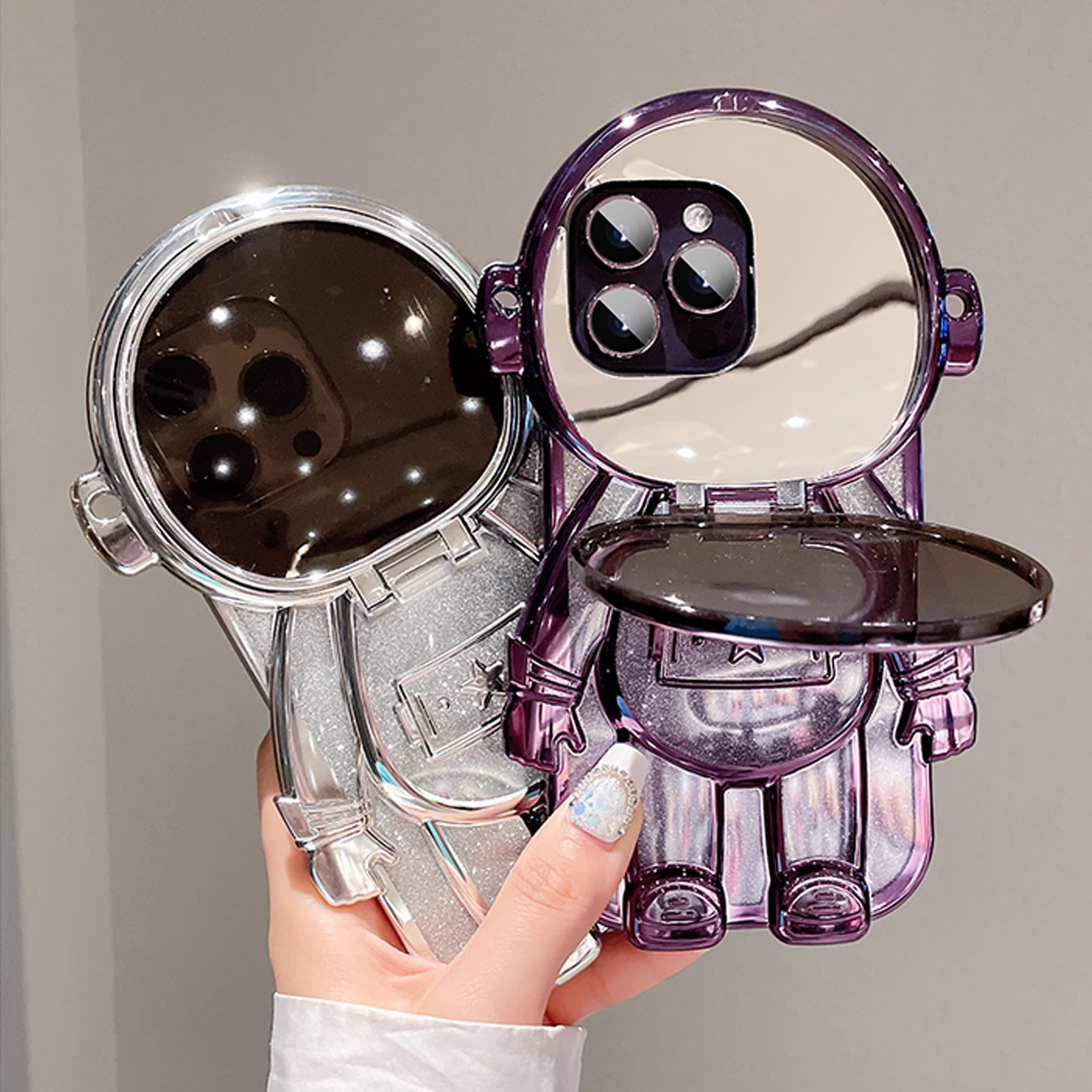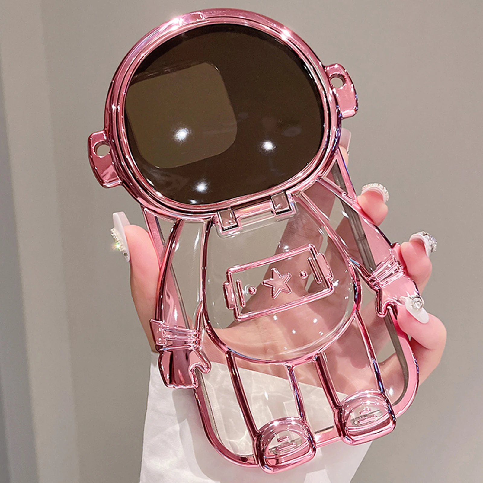 Luxury 3D Astronaut Lens Makeup Mirror Bracket Strap Phone Case For iPhone