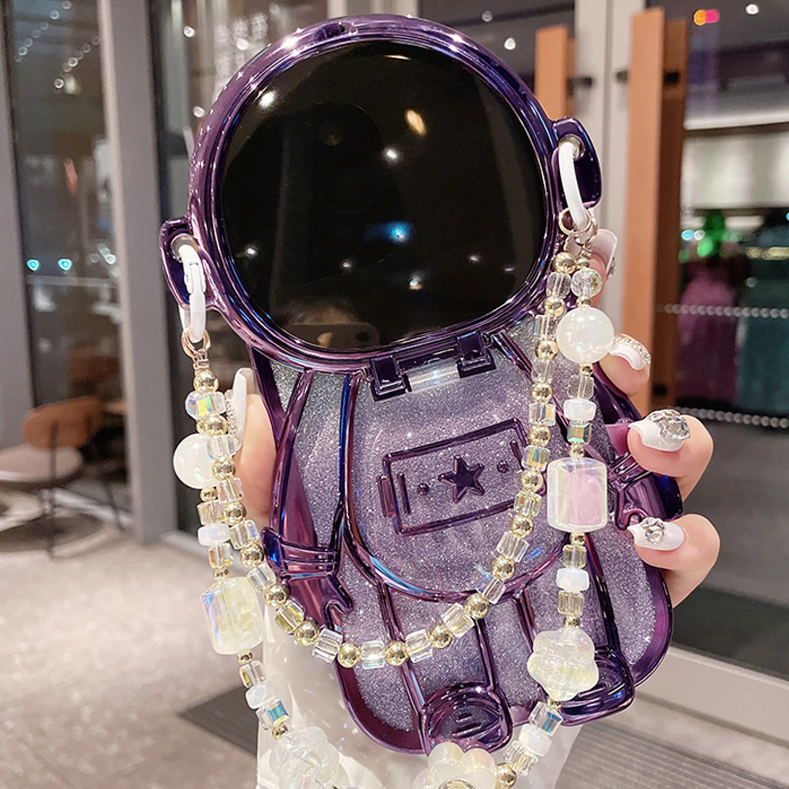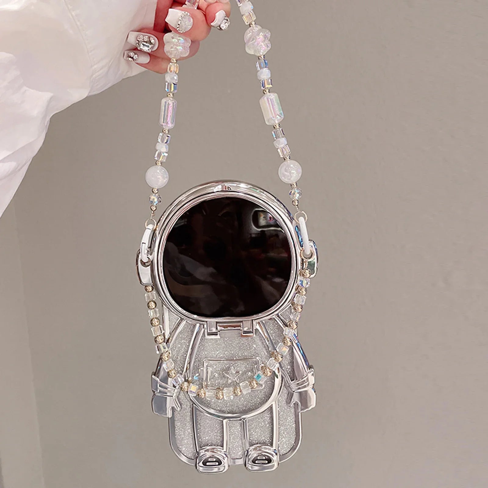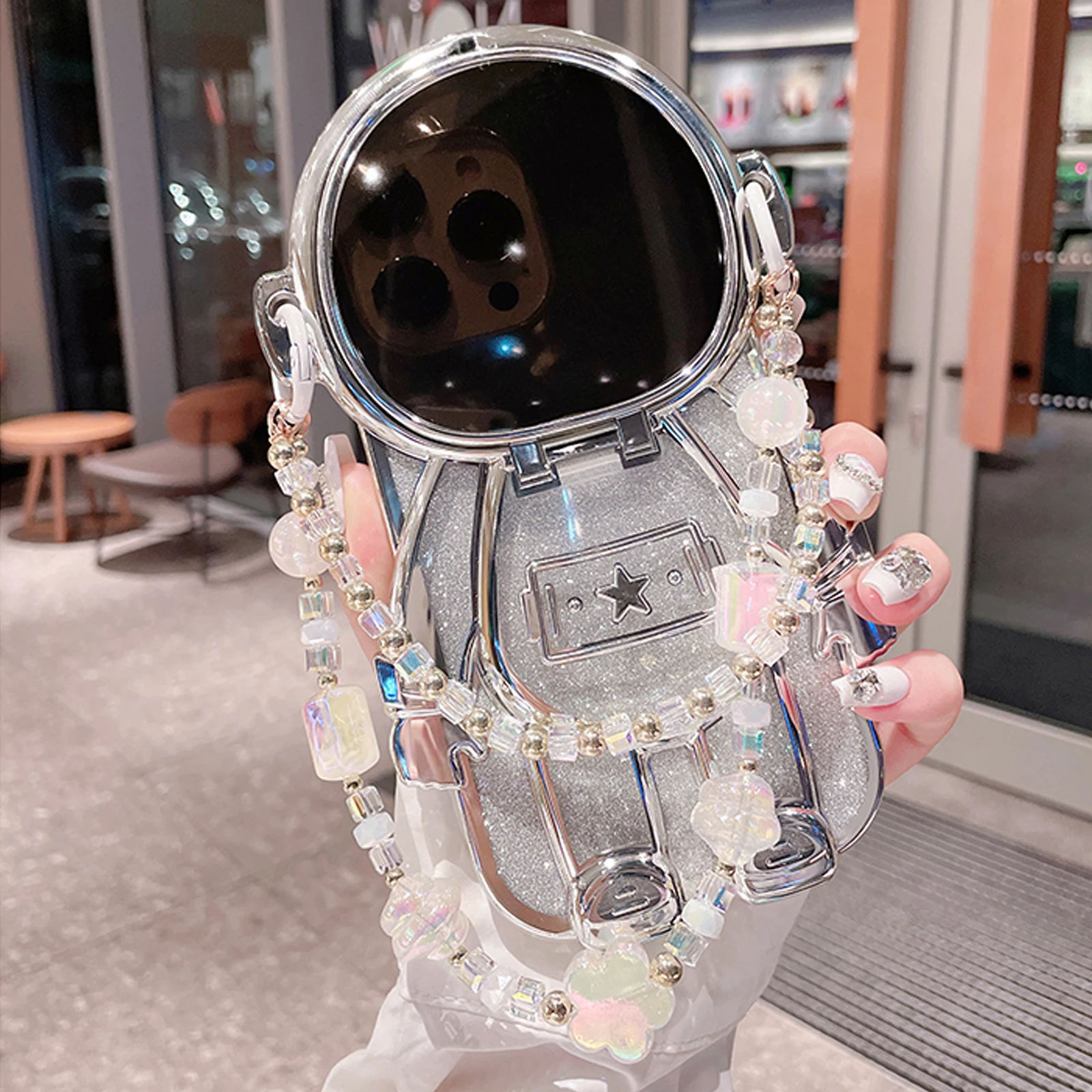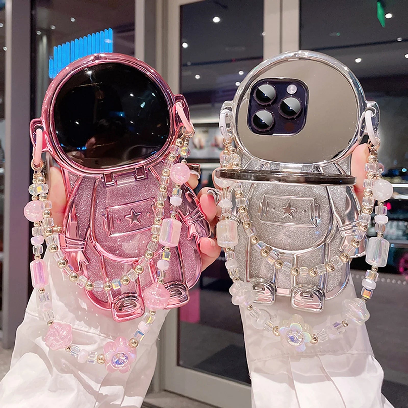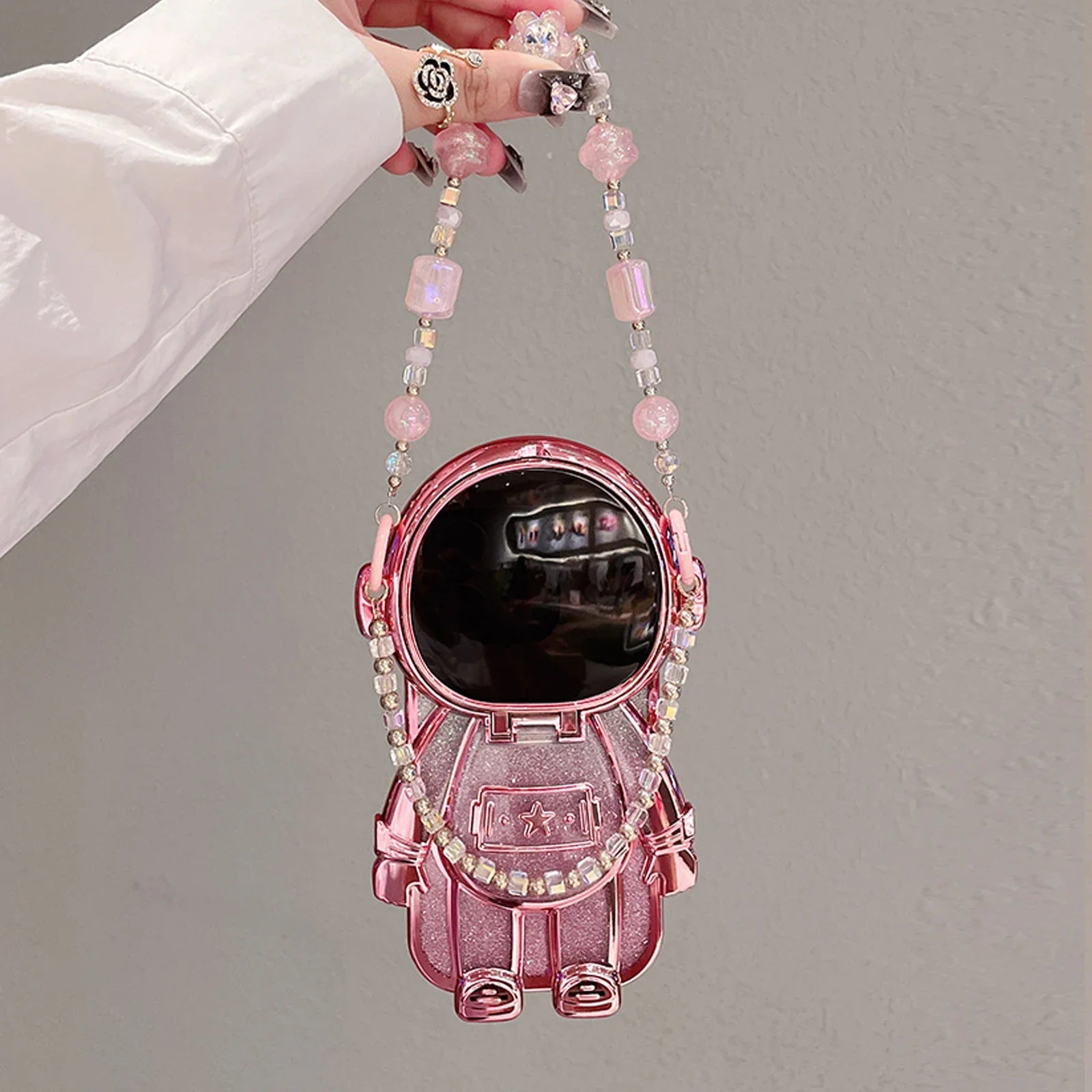 Luxury 3D Astronaut Lens Makeup Mirror Bracket Strap Phone Case For iPhone