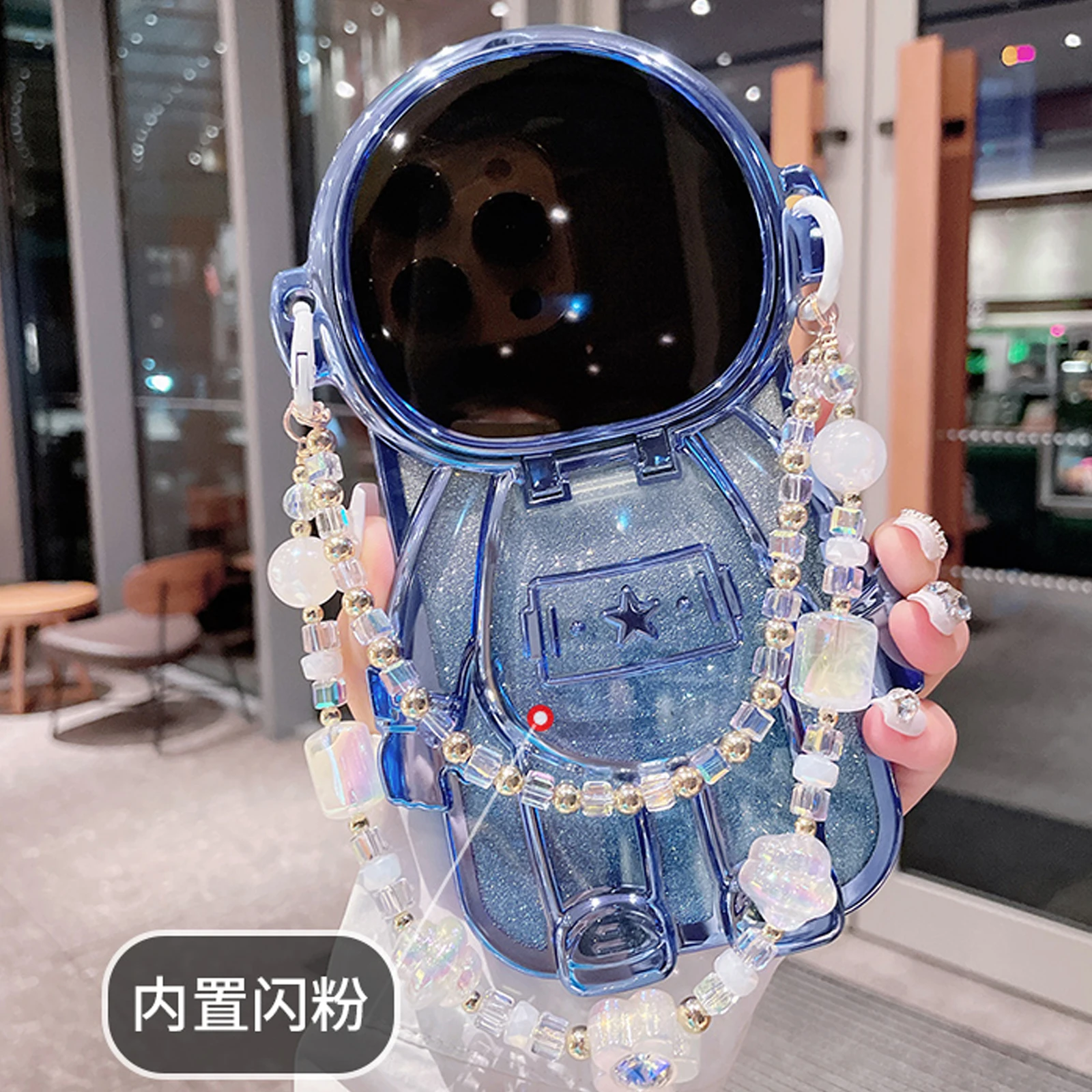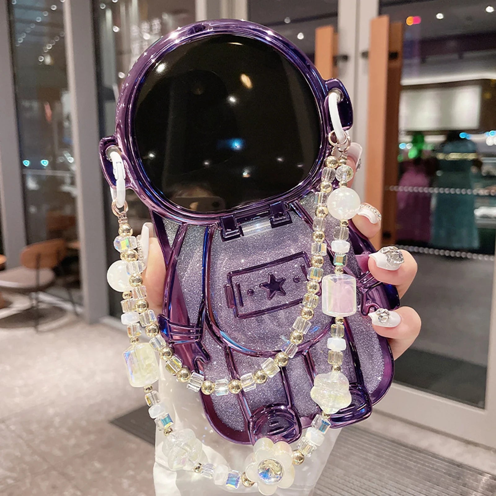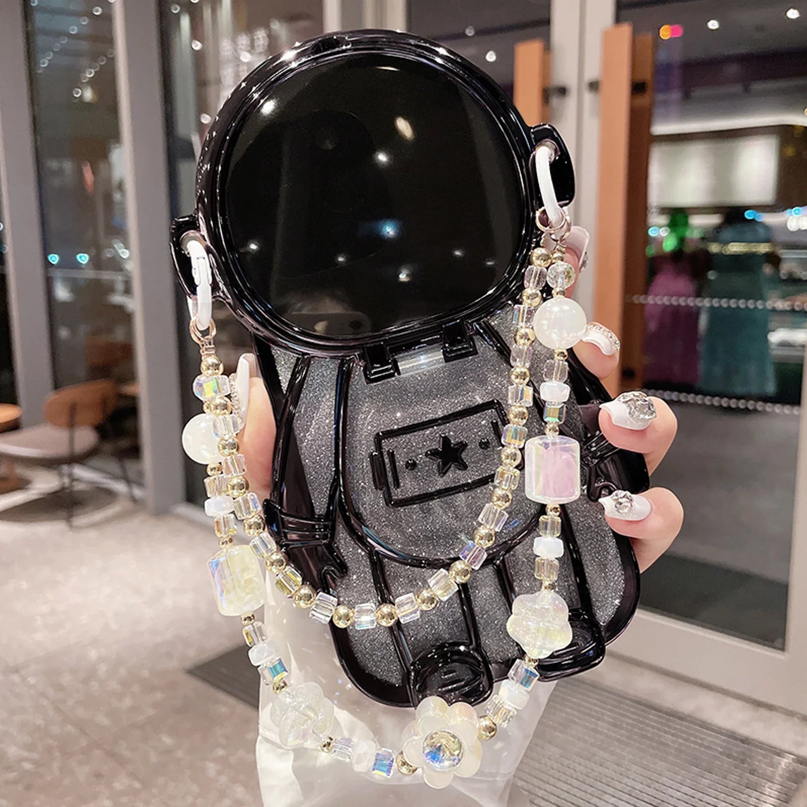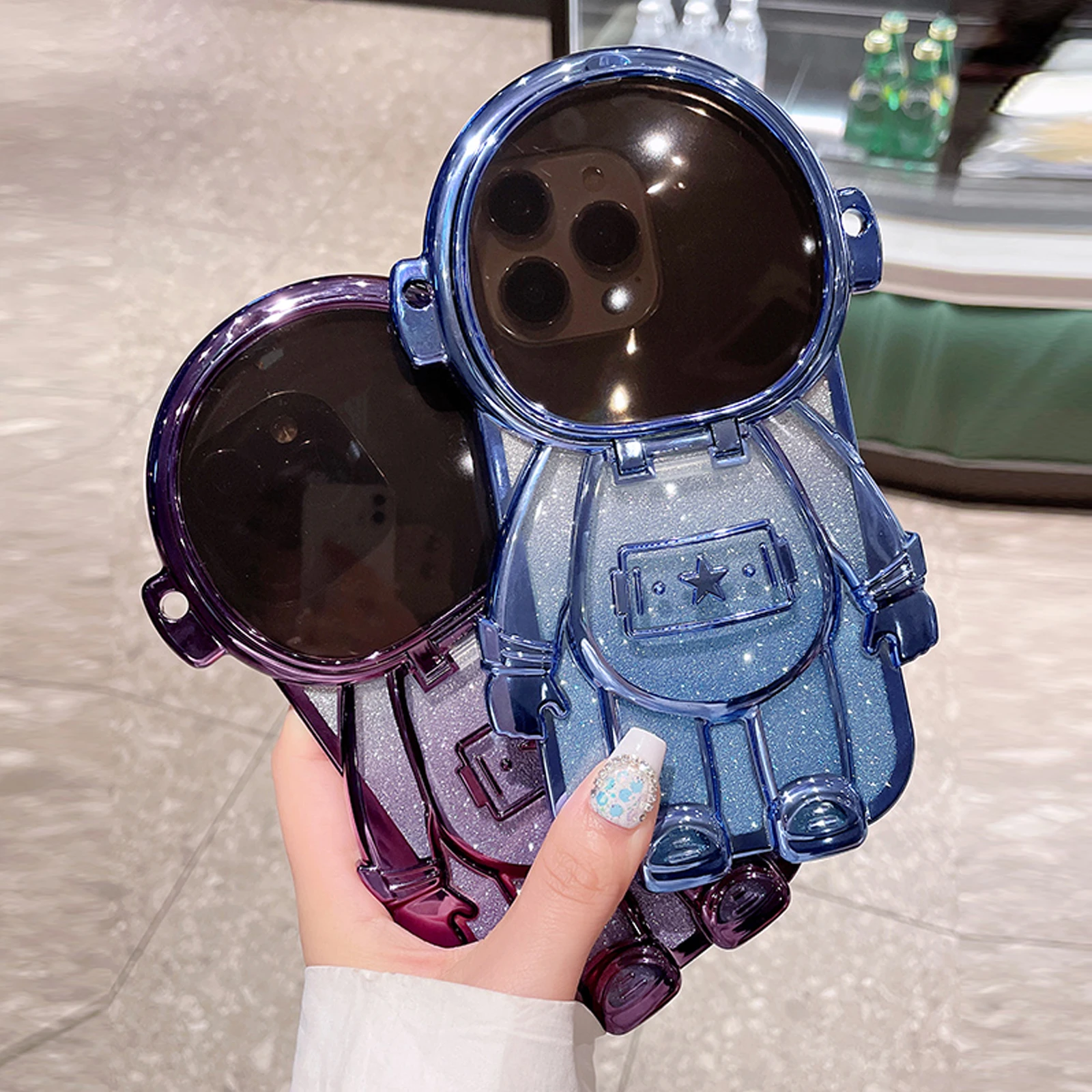 Luxury 3D Astronaut Lens Makeup Mirror Bracket Strap Phone Case For iPhone