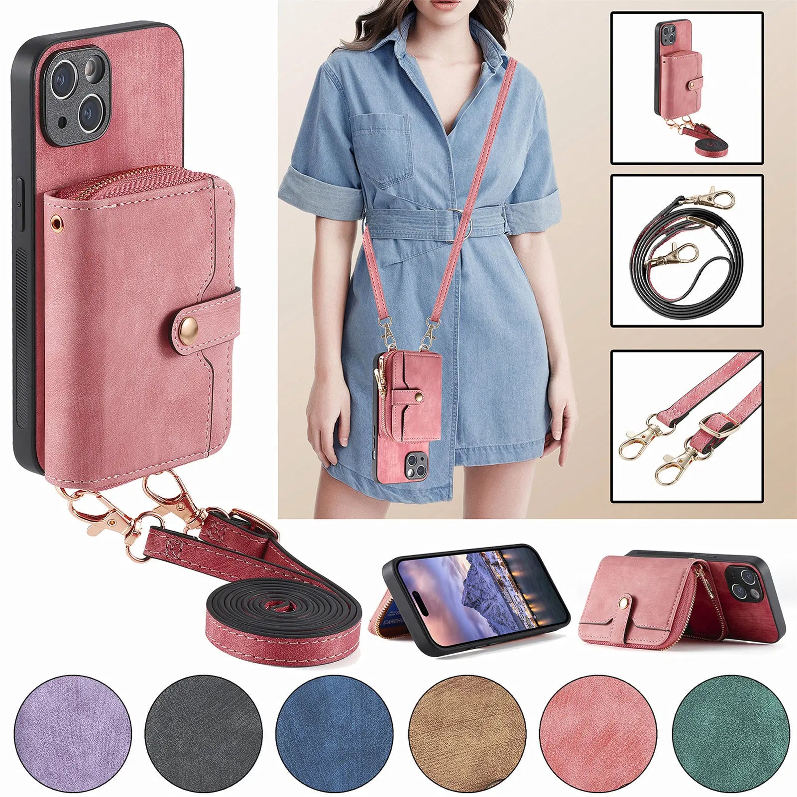Luxury Crossbody Zipper Leather Rope Card Pocket Case For iPhone