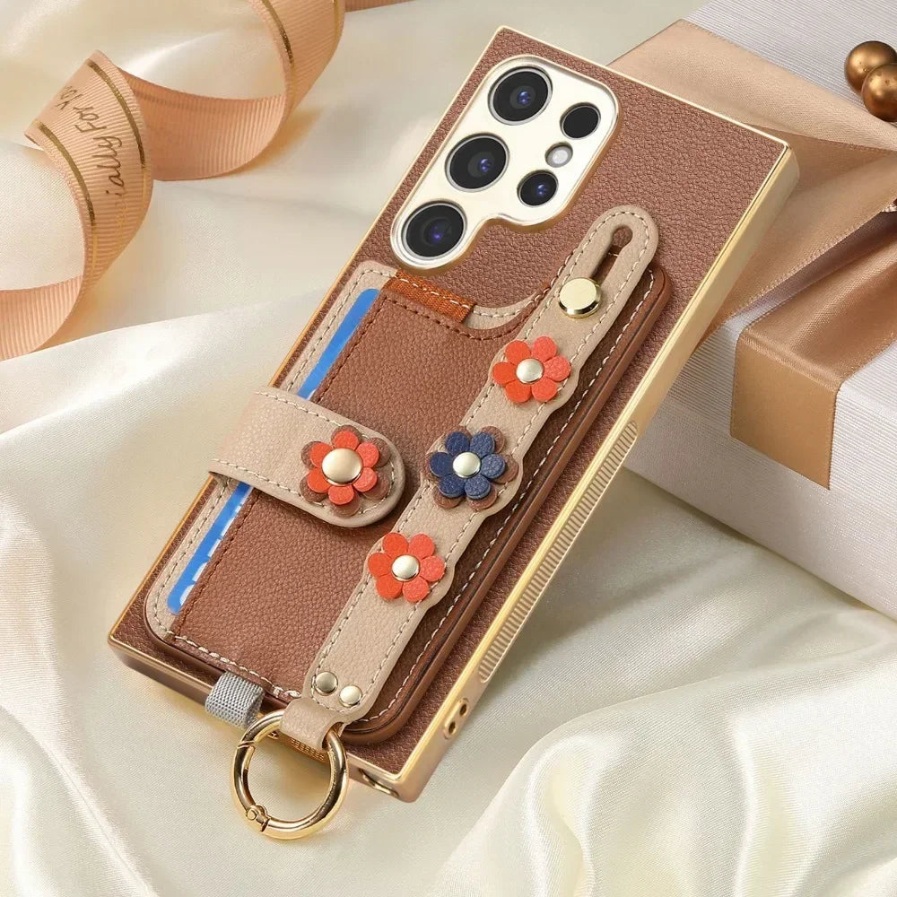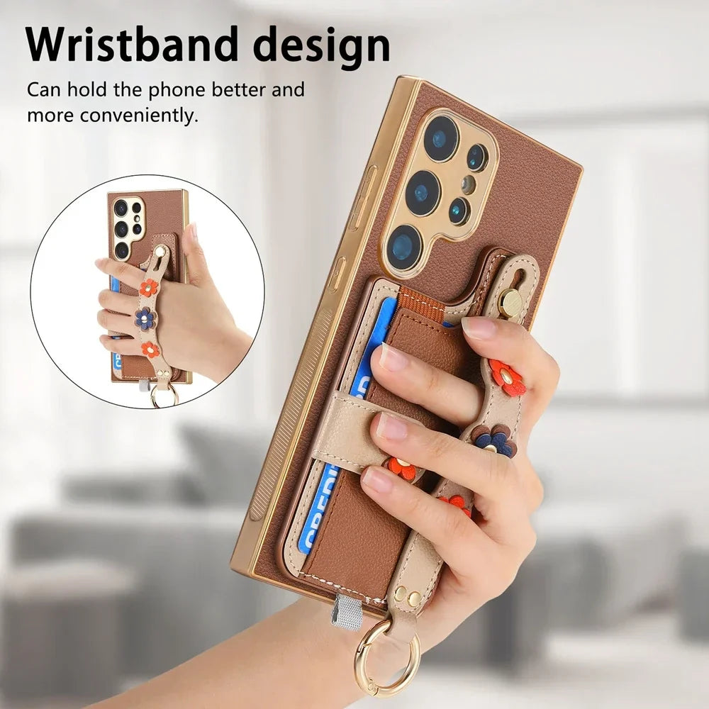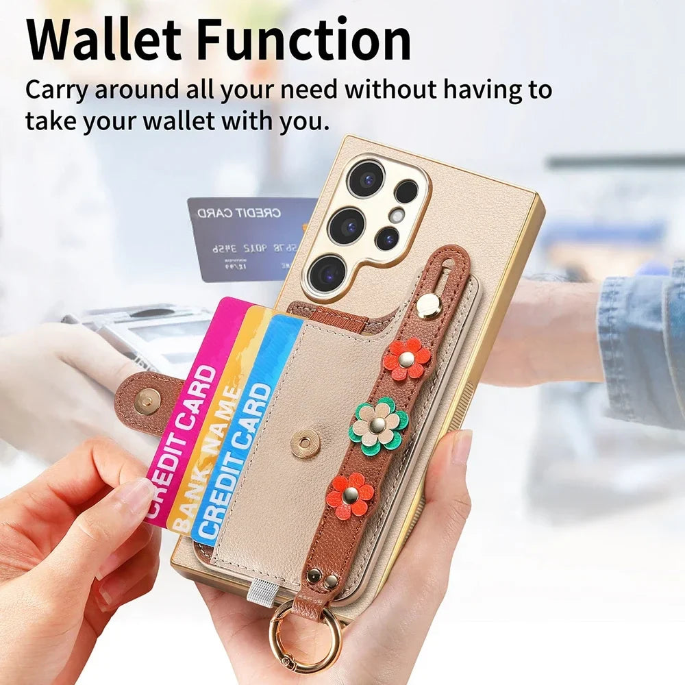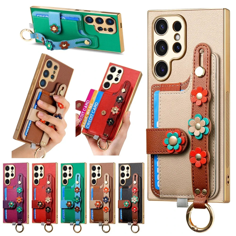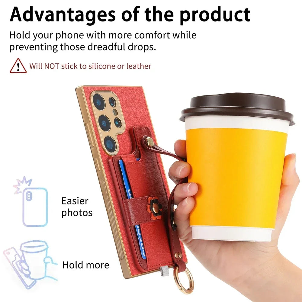Crossbody Lanyard Ring Wrist Strap Card Holder Leather Case for Samsung