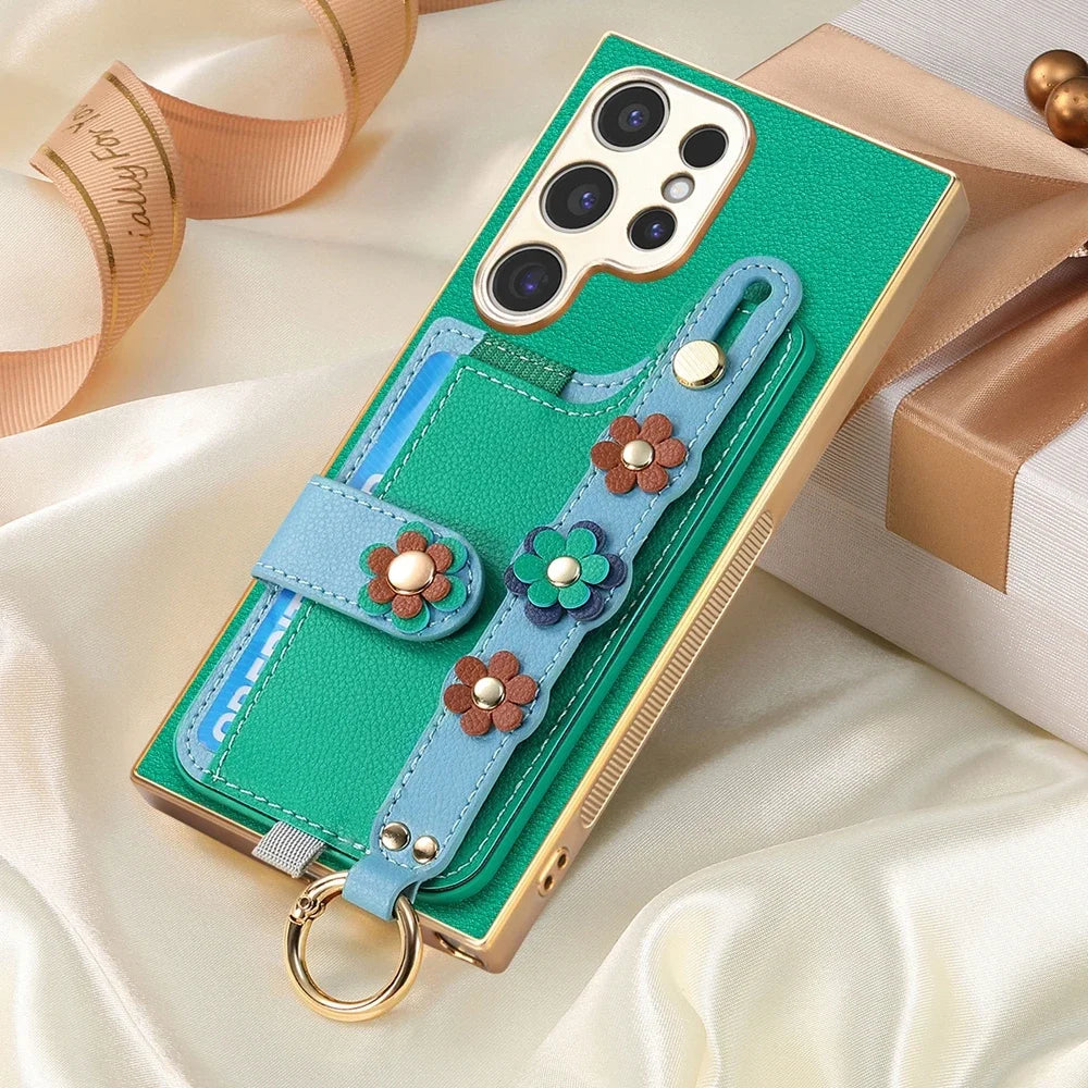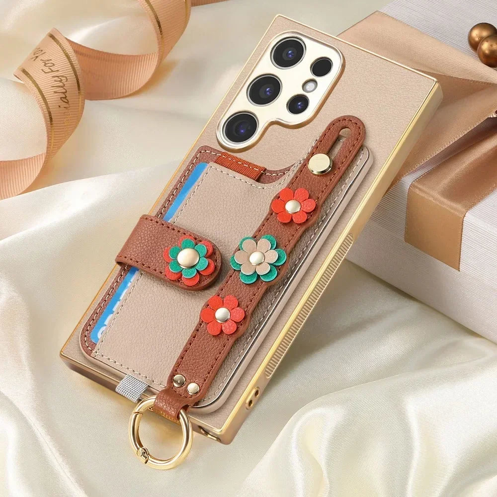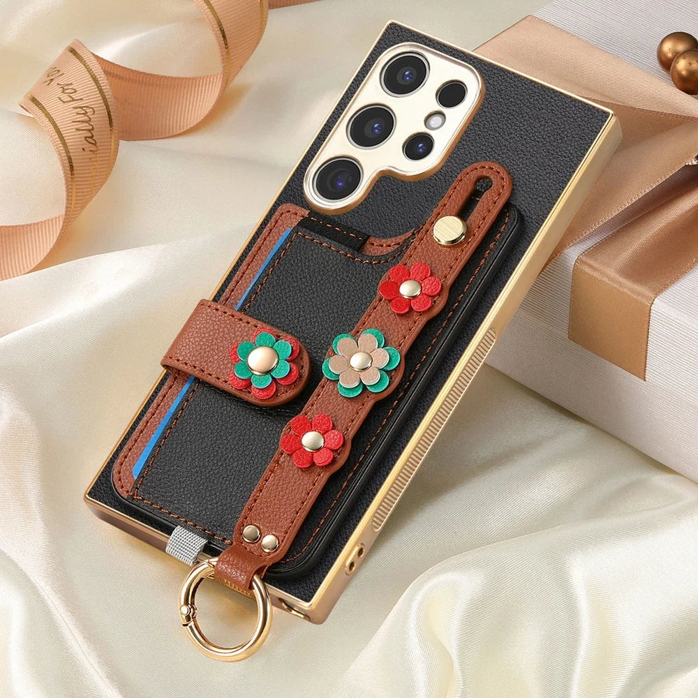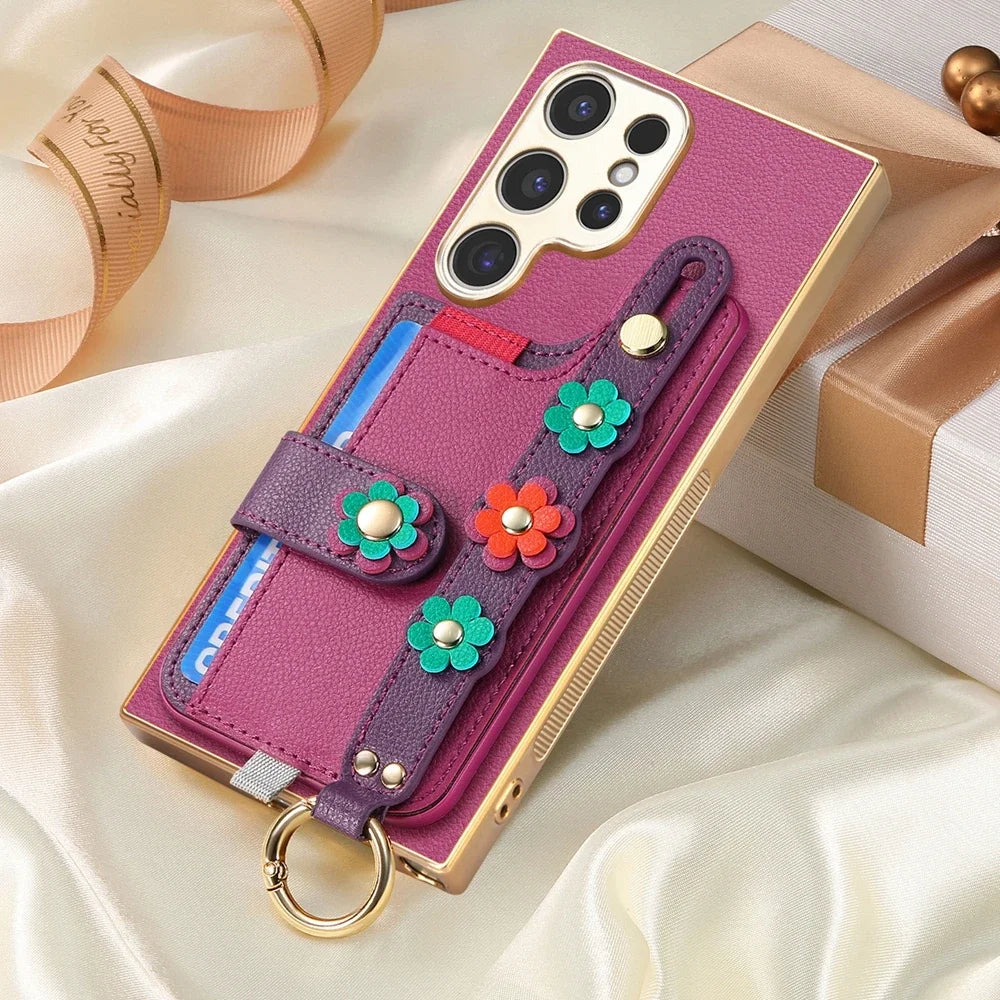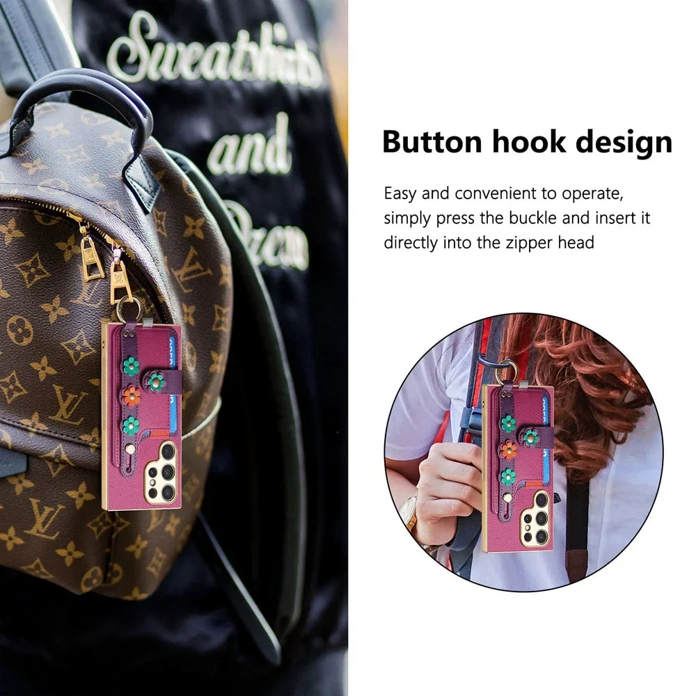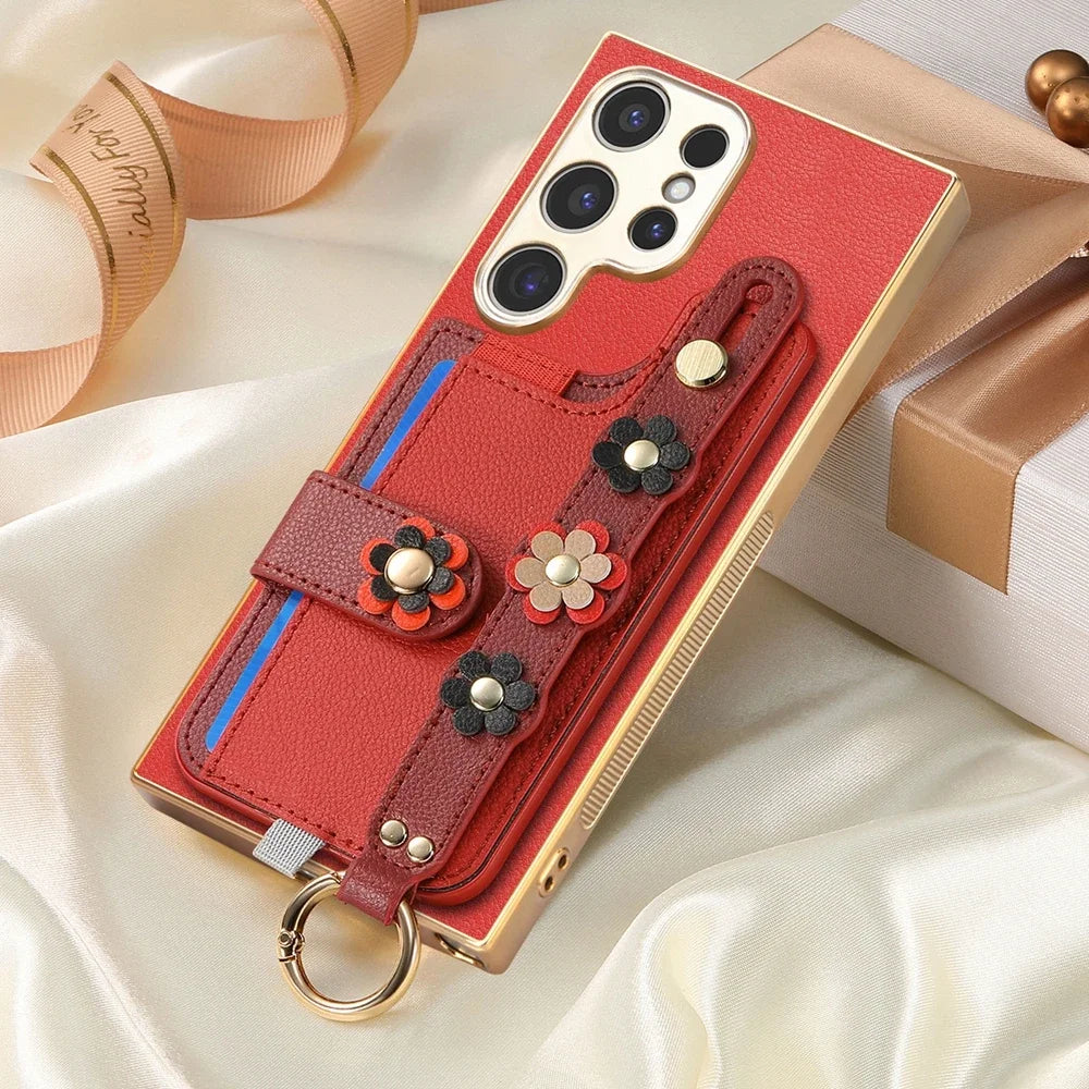 Crossbody Lanyard Ring Wrist Strap Card Holder Leather Case for Samsung