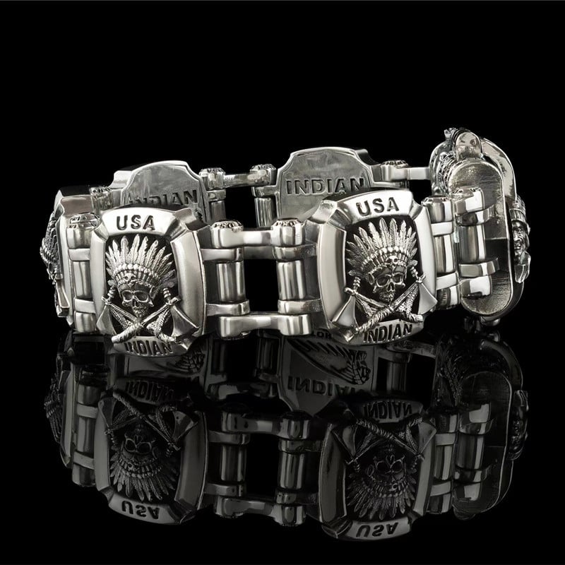 ☠The Patriotic Rider Skull Bracelet is handmade and features the Stars and Stripes, different military medals and bullet details. Super bold, chunky, heavy metal and totally badass, this bracelet is an impeccable piece of wearable art.