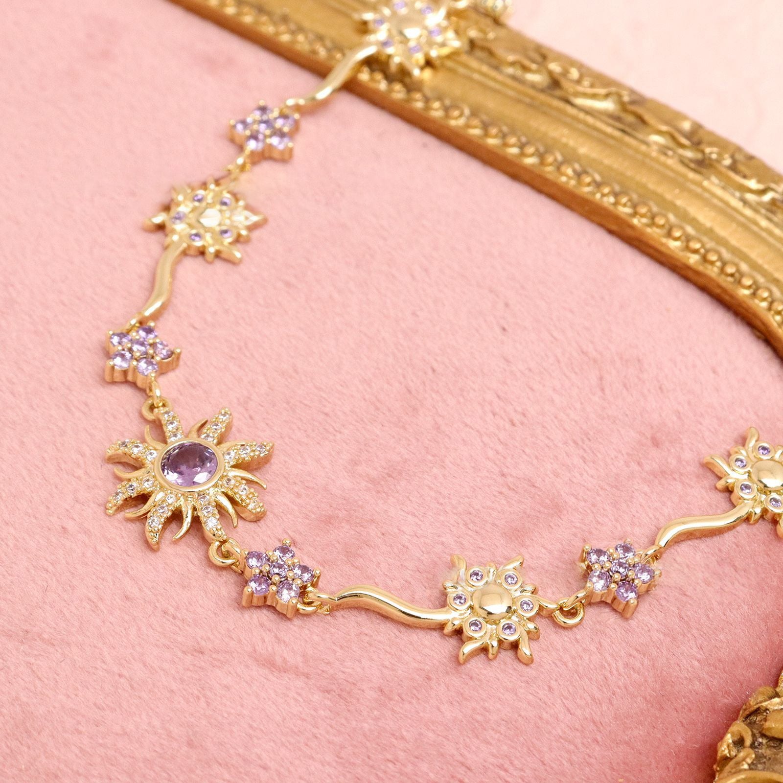 Let the sunshine follow you wherever you go with the Tangled Sun Bracelet by Reyybie Jewelry. This delicate piece features a captivating sun design with sparkling zirconia stones, all set on a shimmering gold-plated brass band. The soft purple accents add a pop of color and elegance, making it the perfect accessory to elevate any outfit, whether casual or chic.