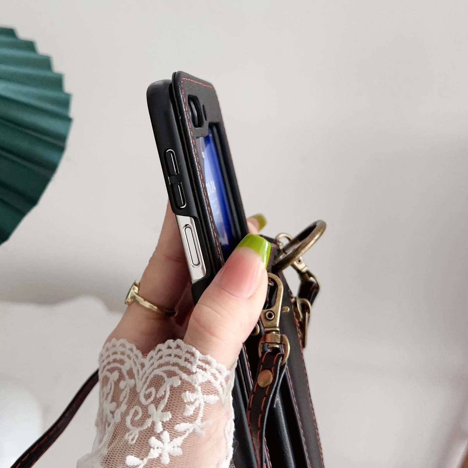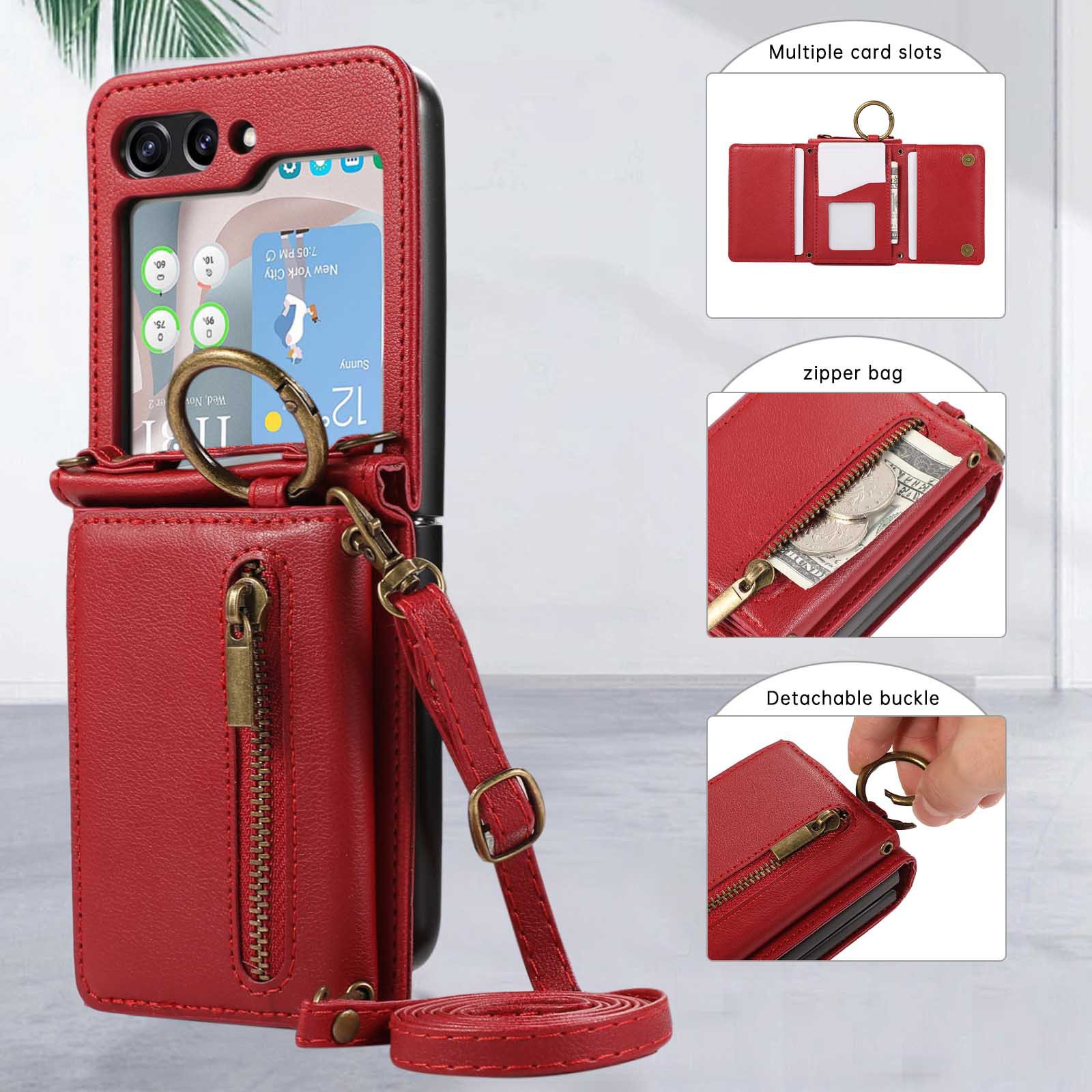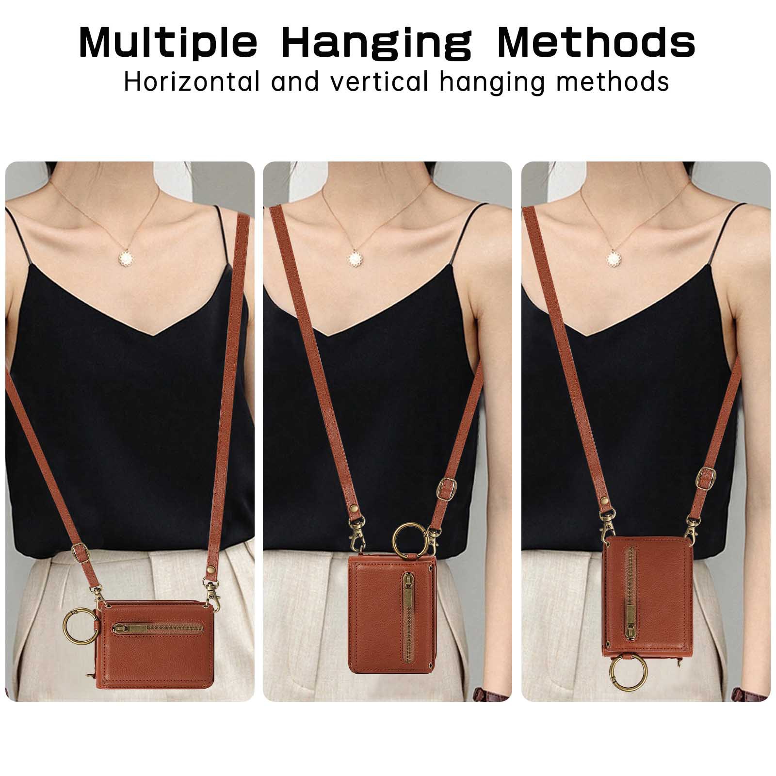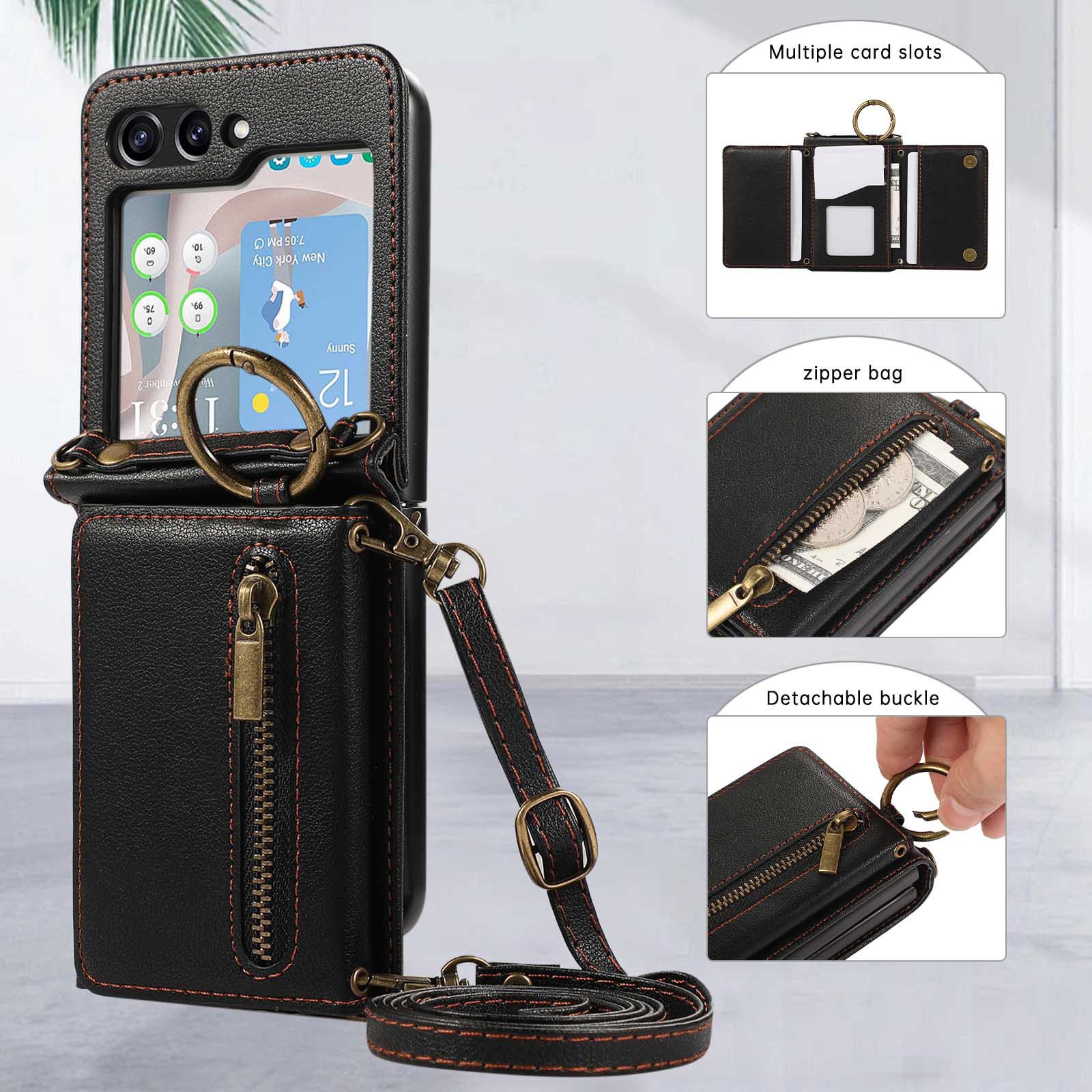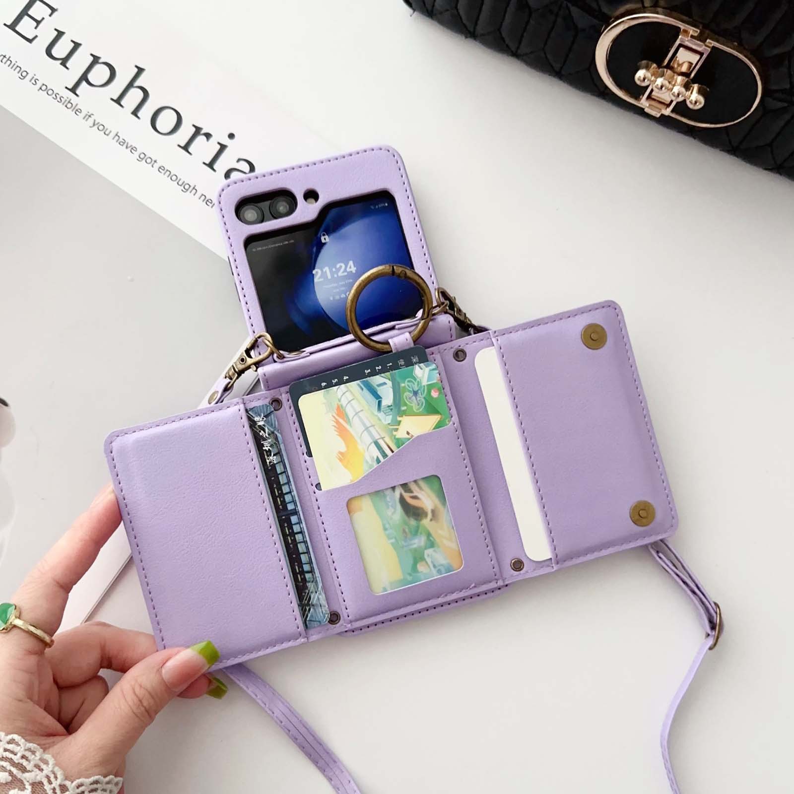 Trifold card holder finger ring buckle crossbody lanyard zipper leather case mobile phone case