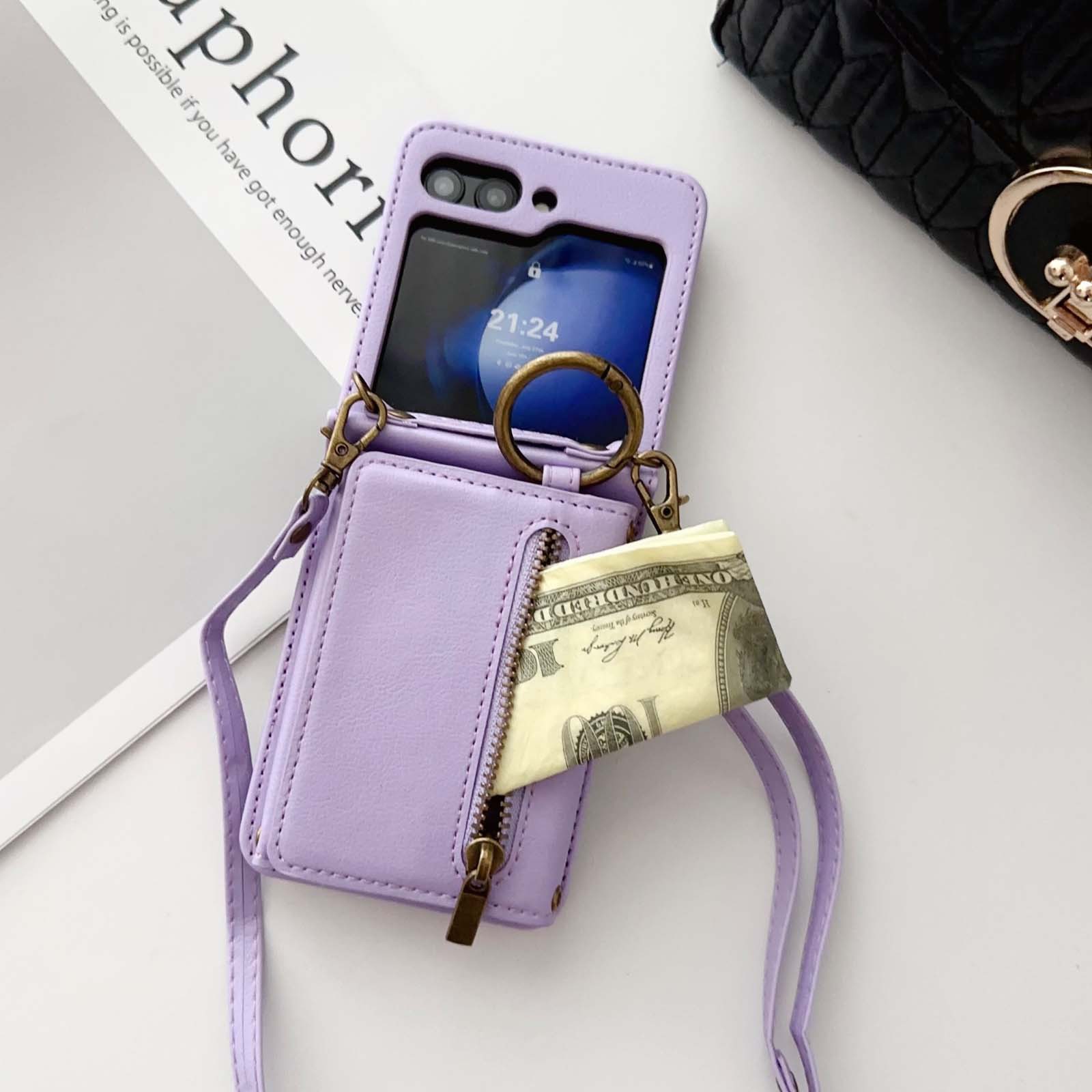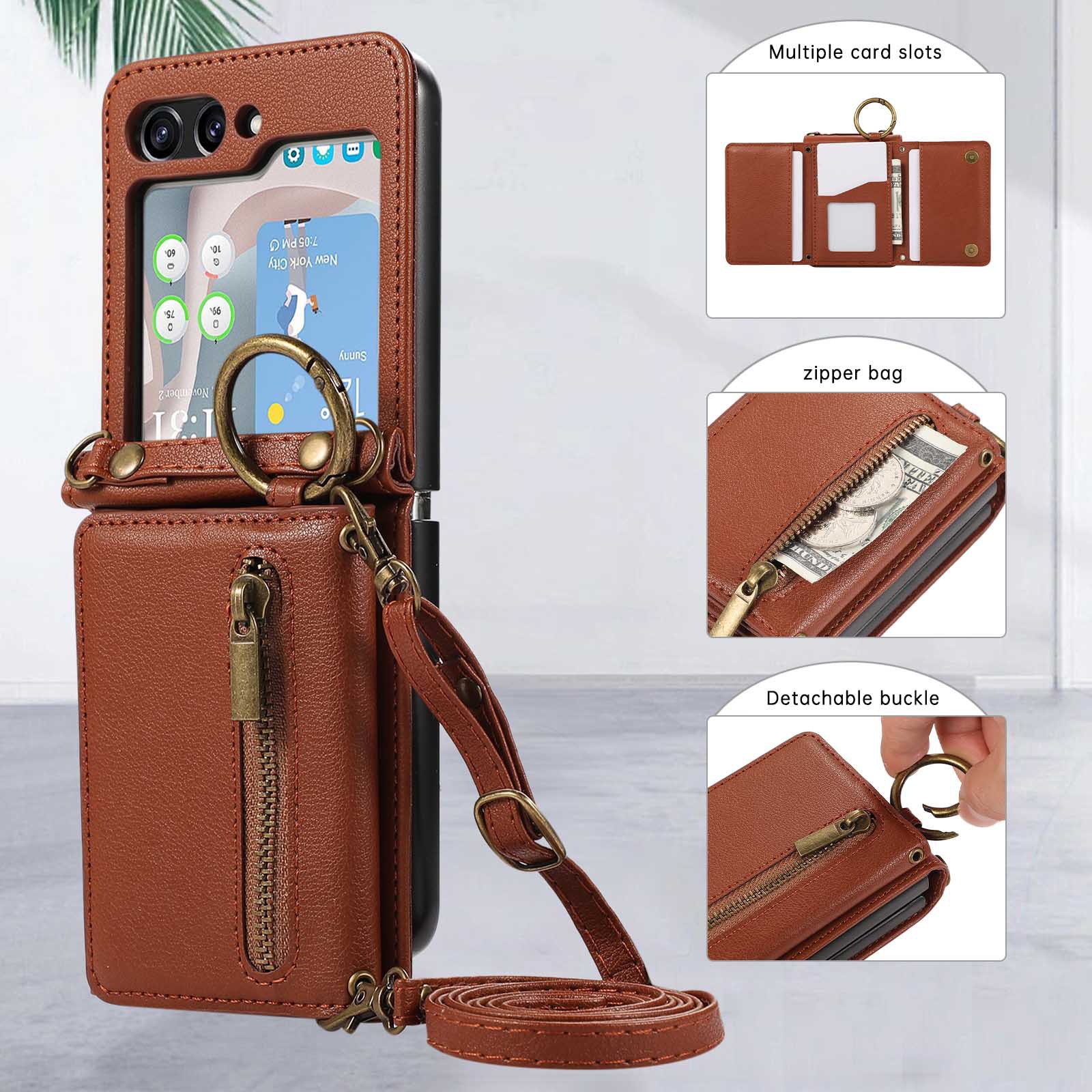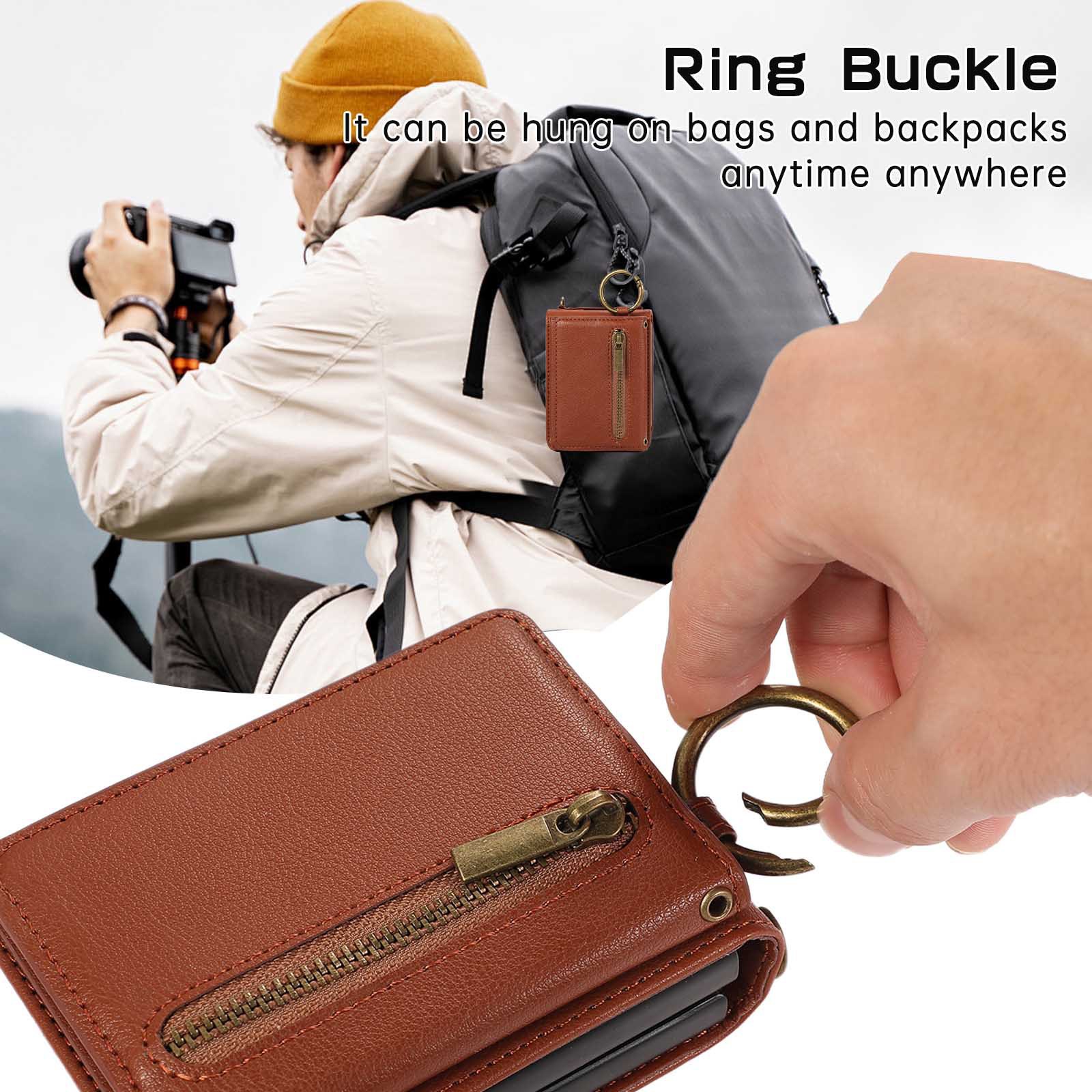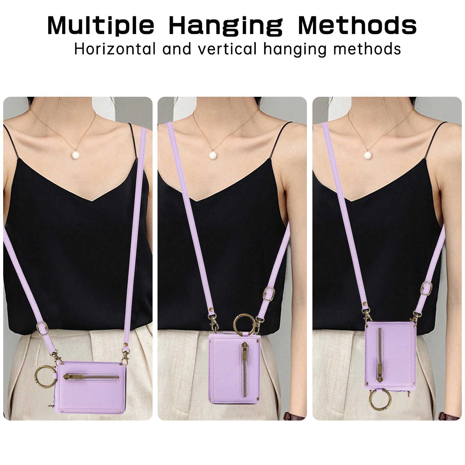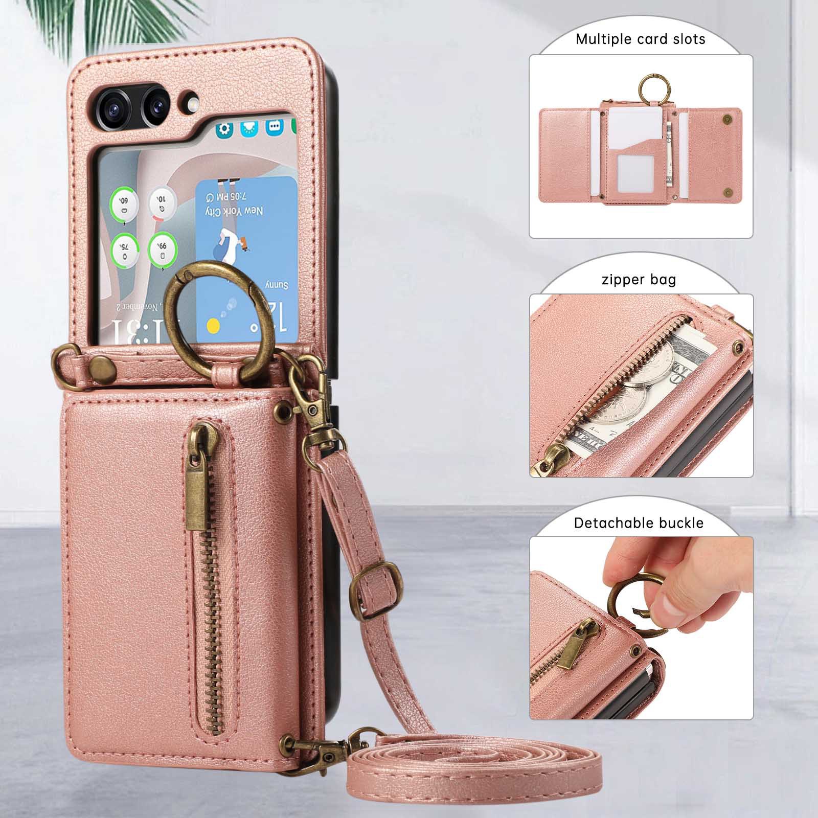 Trifold card holder finger ring buckle crossbody lanyard zipper leather case mobile phone case