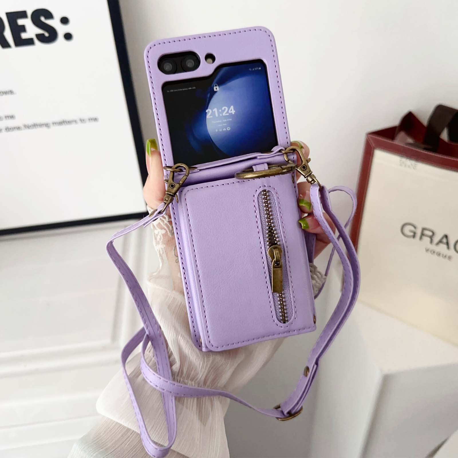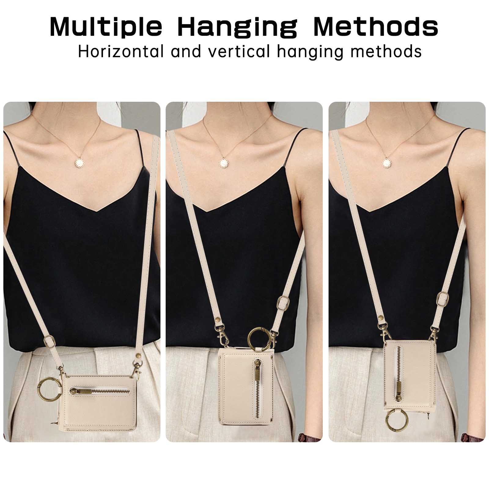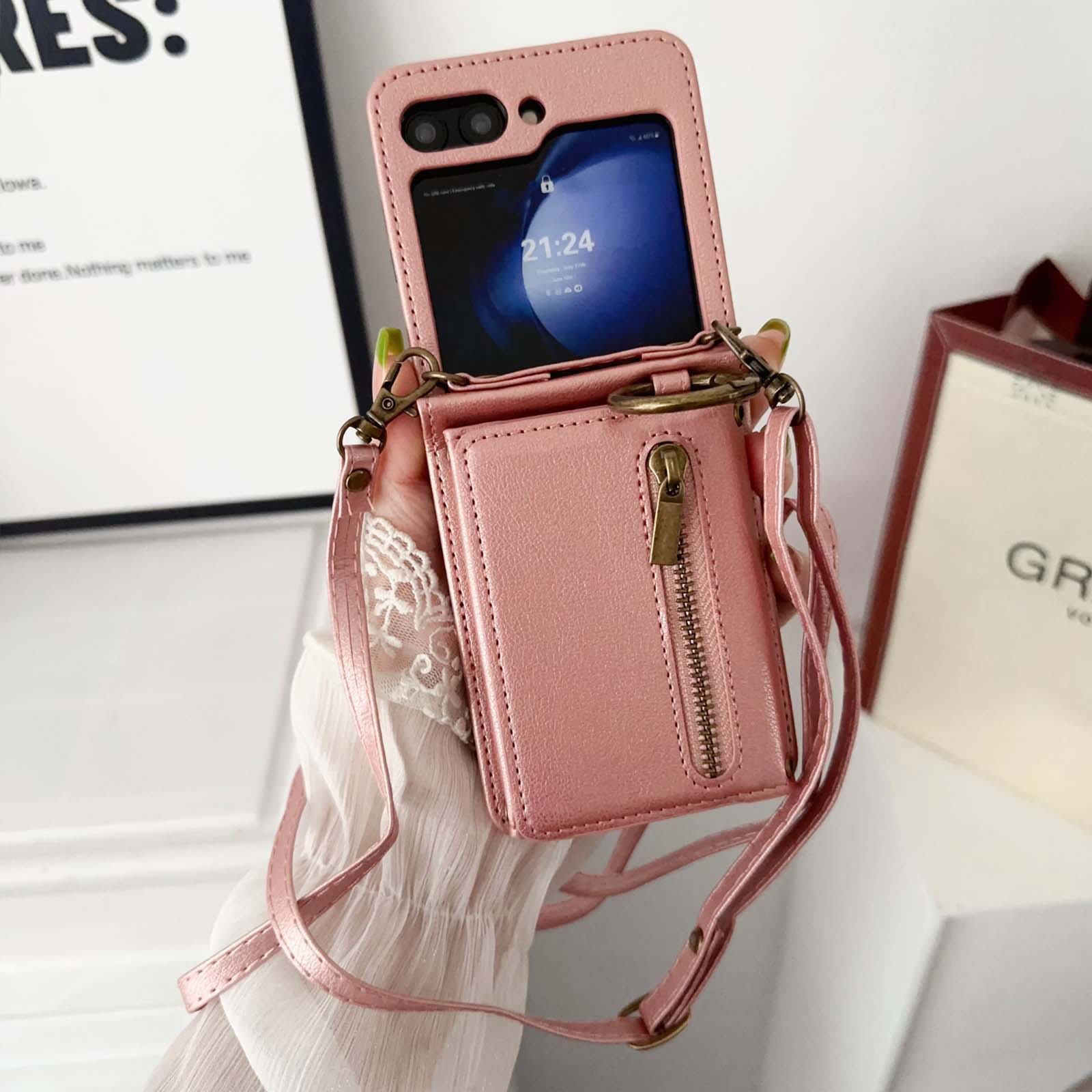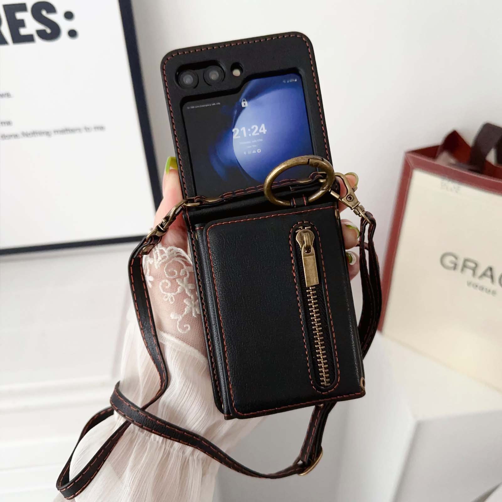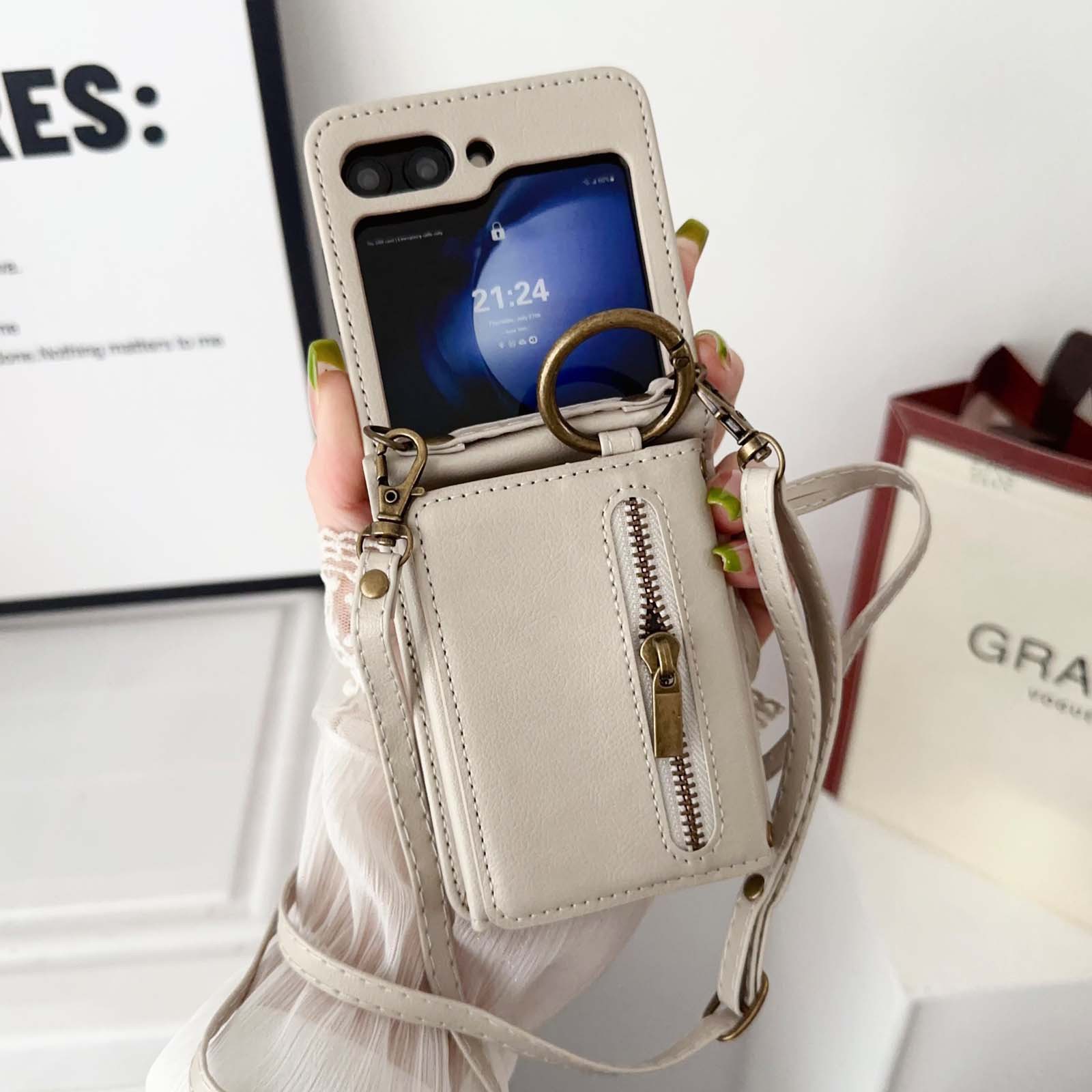 Trifold card holder finger ring buckle crossbody lanyard zipper leather case mobile phone case
