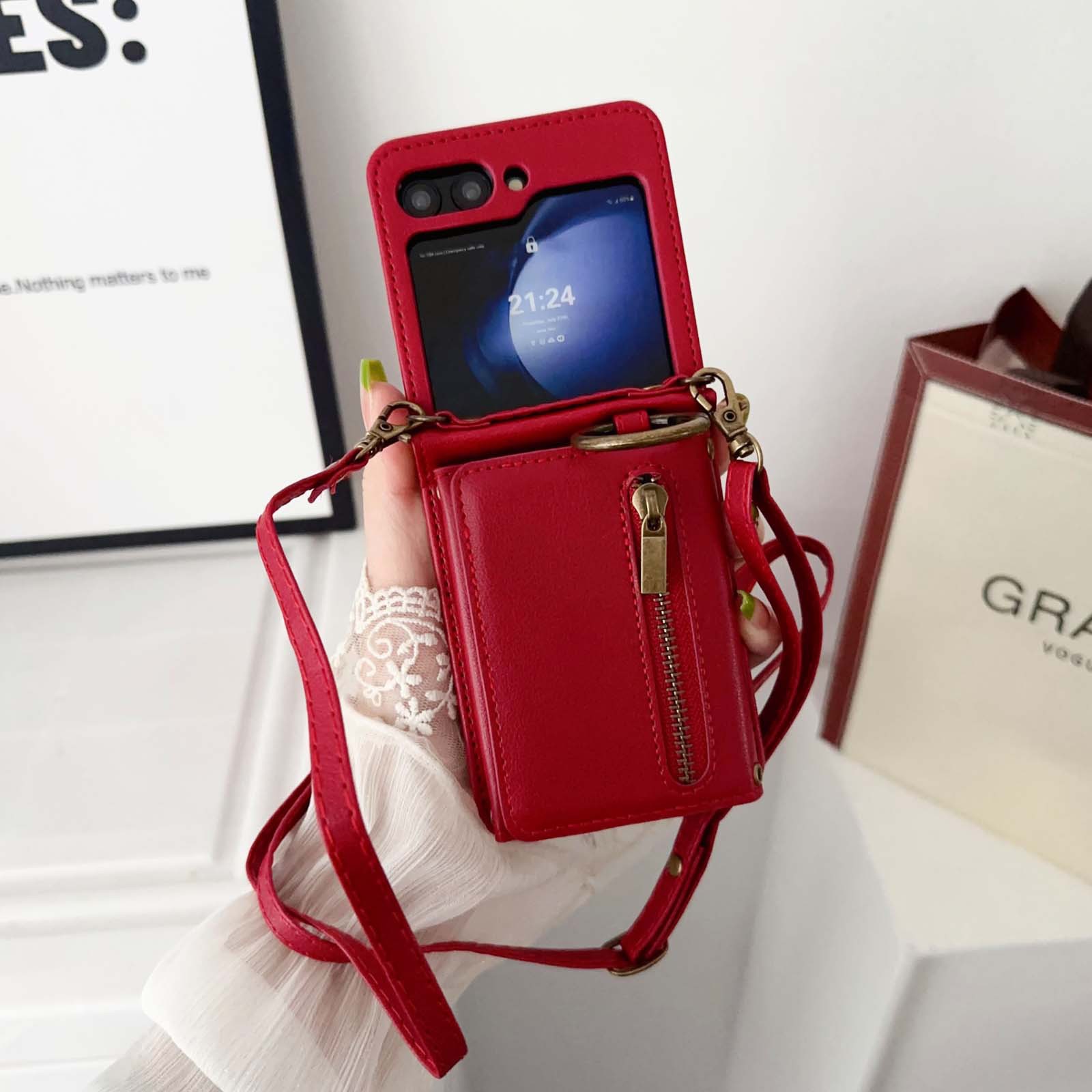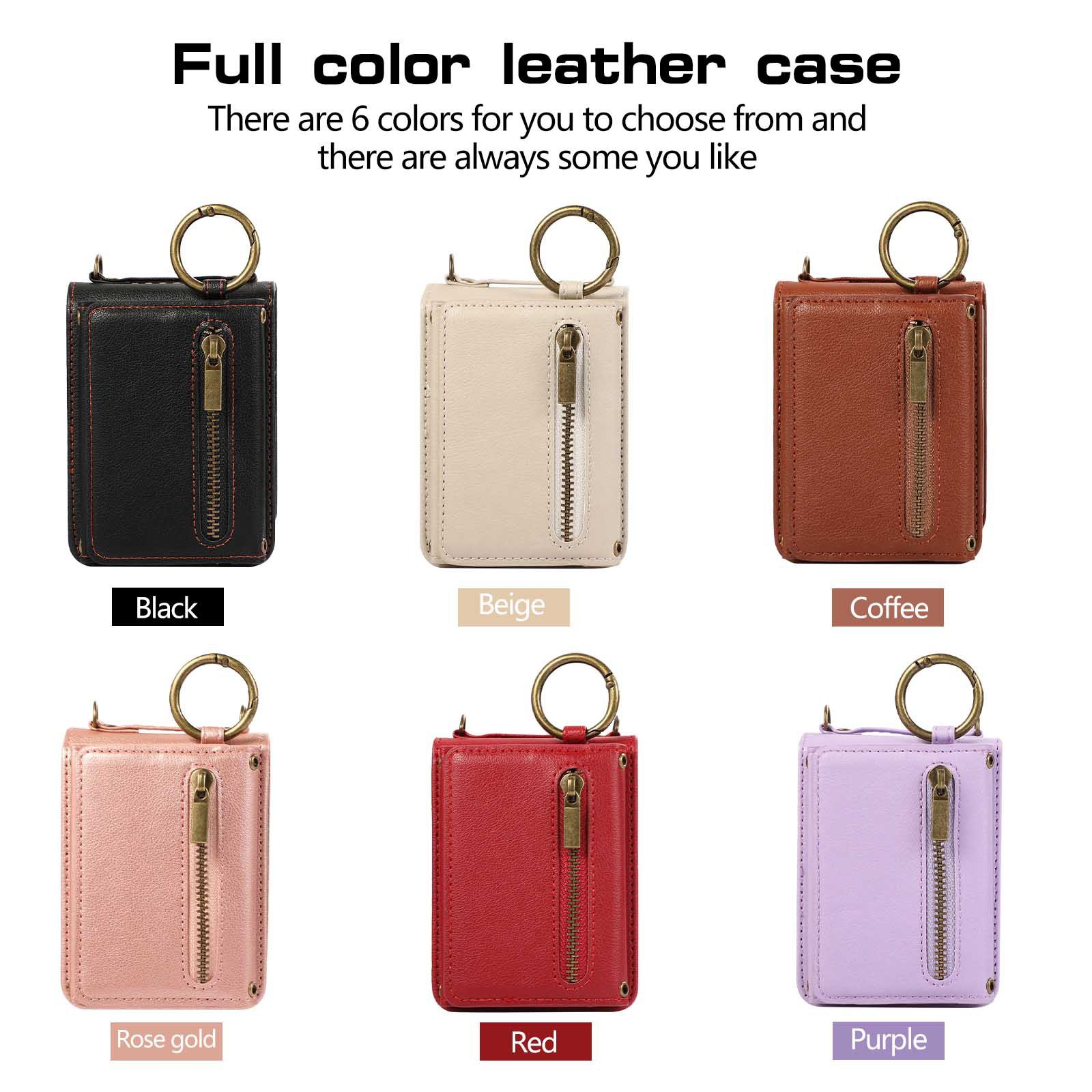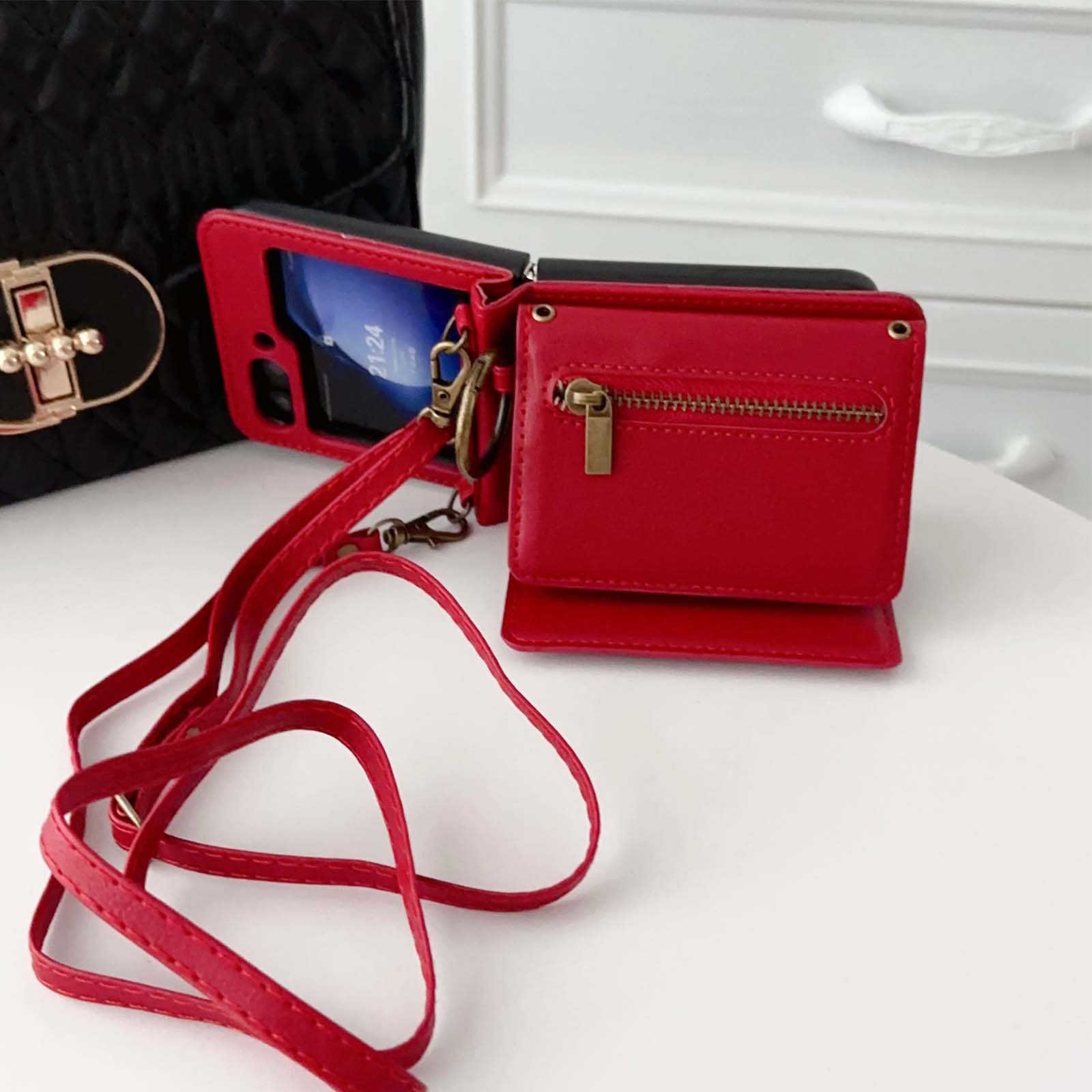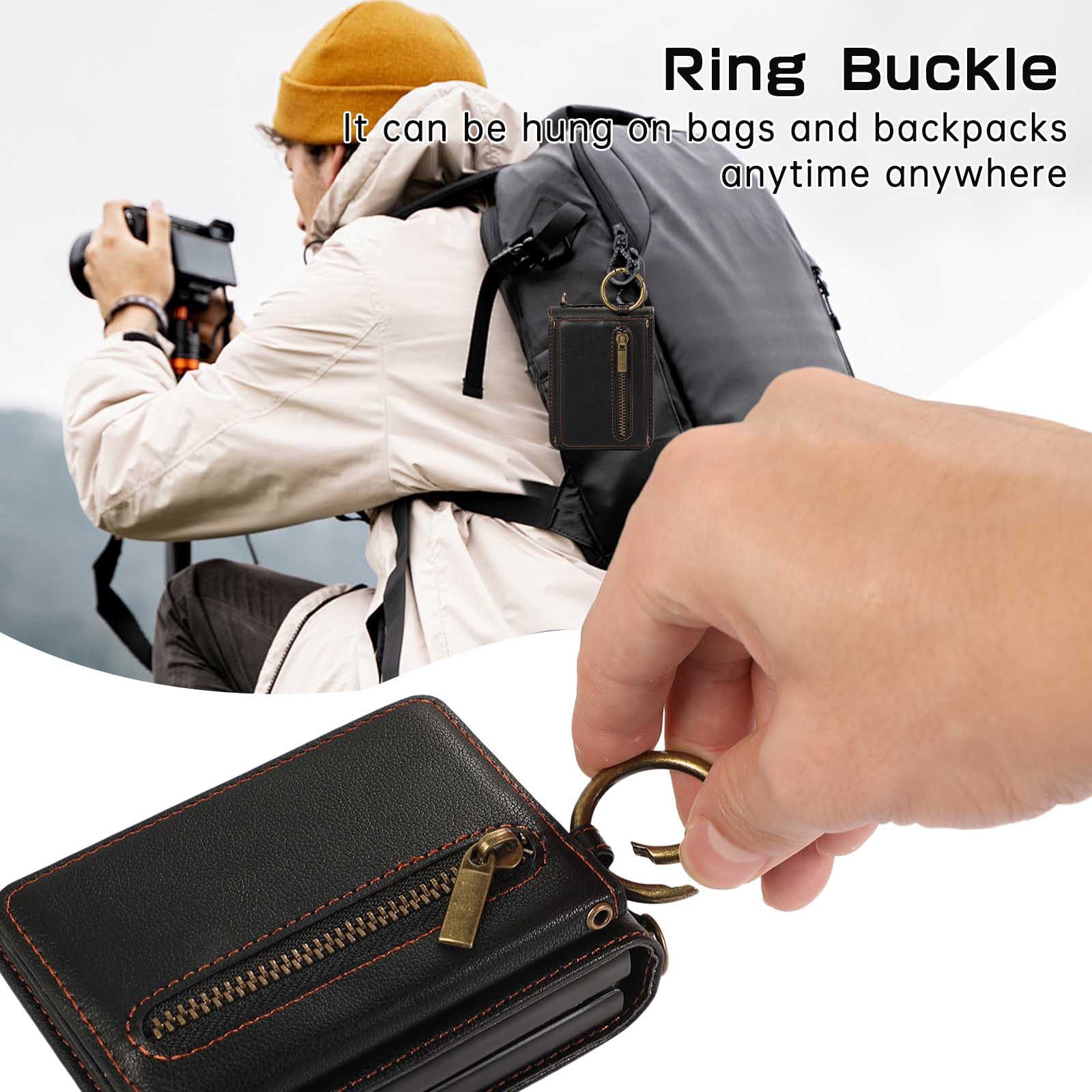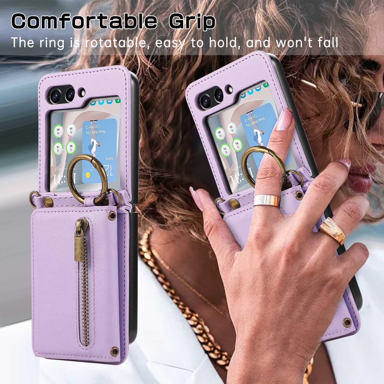 Trifold card holder finger ring buckle crossbody lanyard zipper leather case mobile phone case