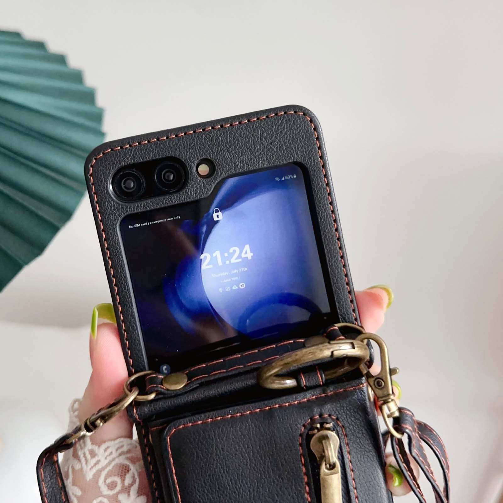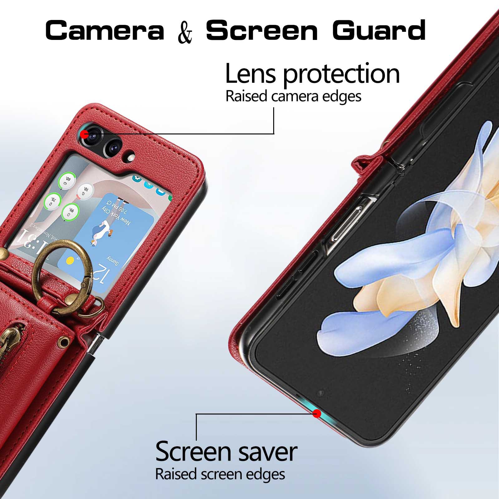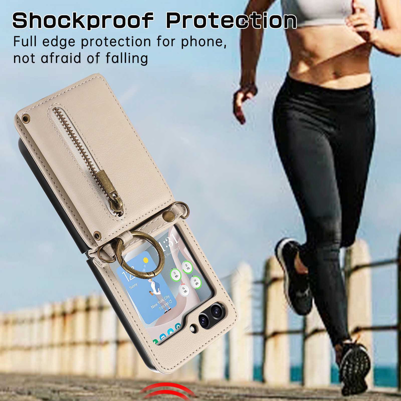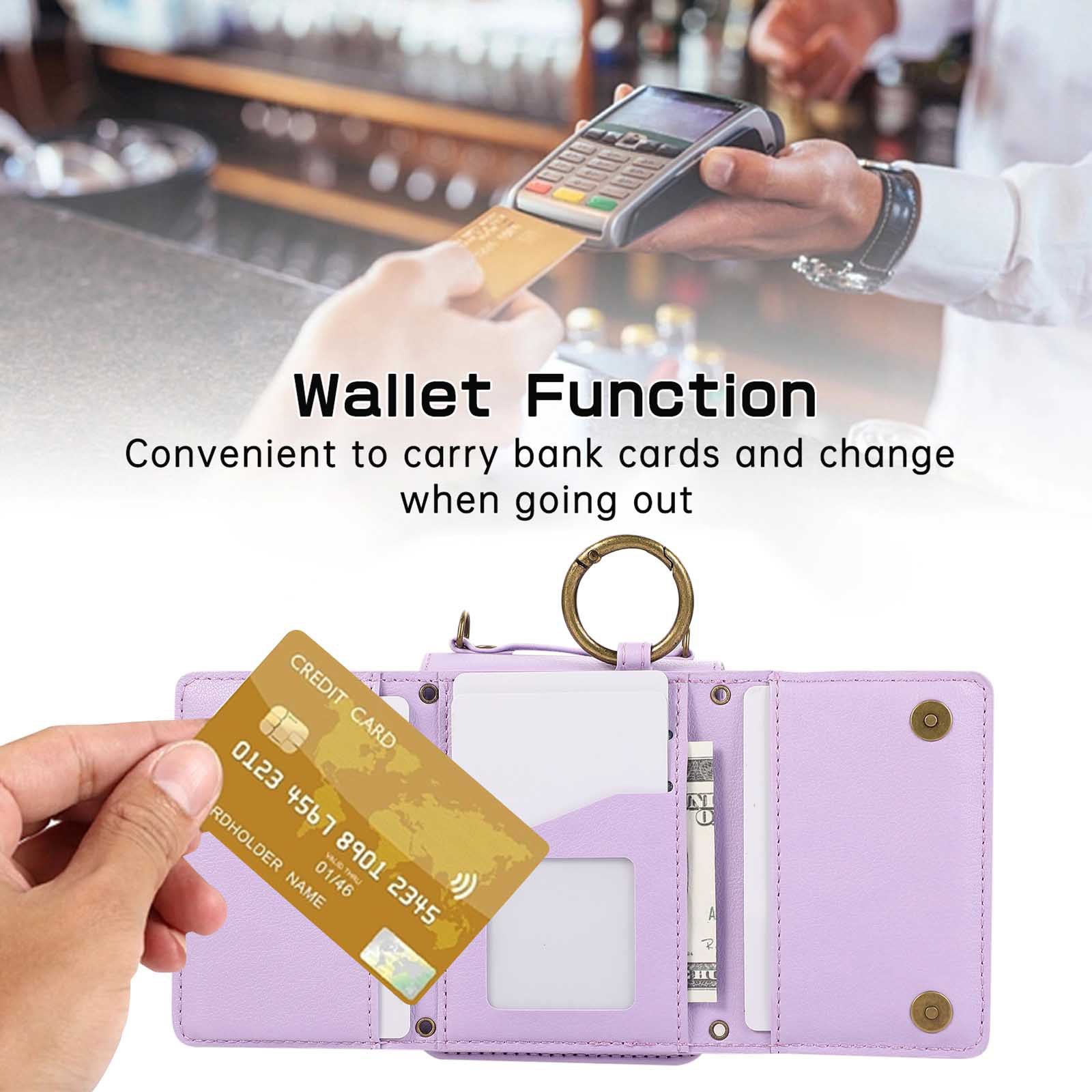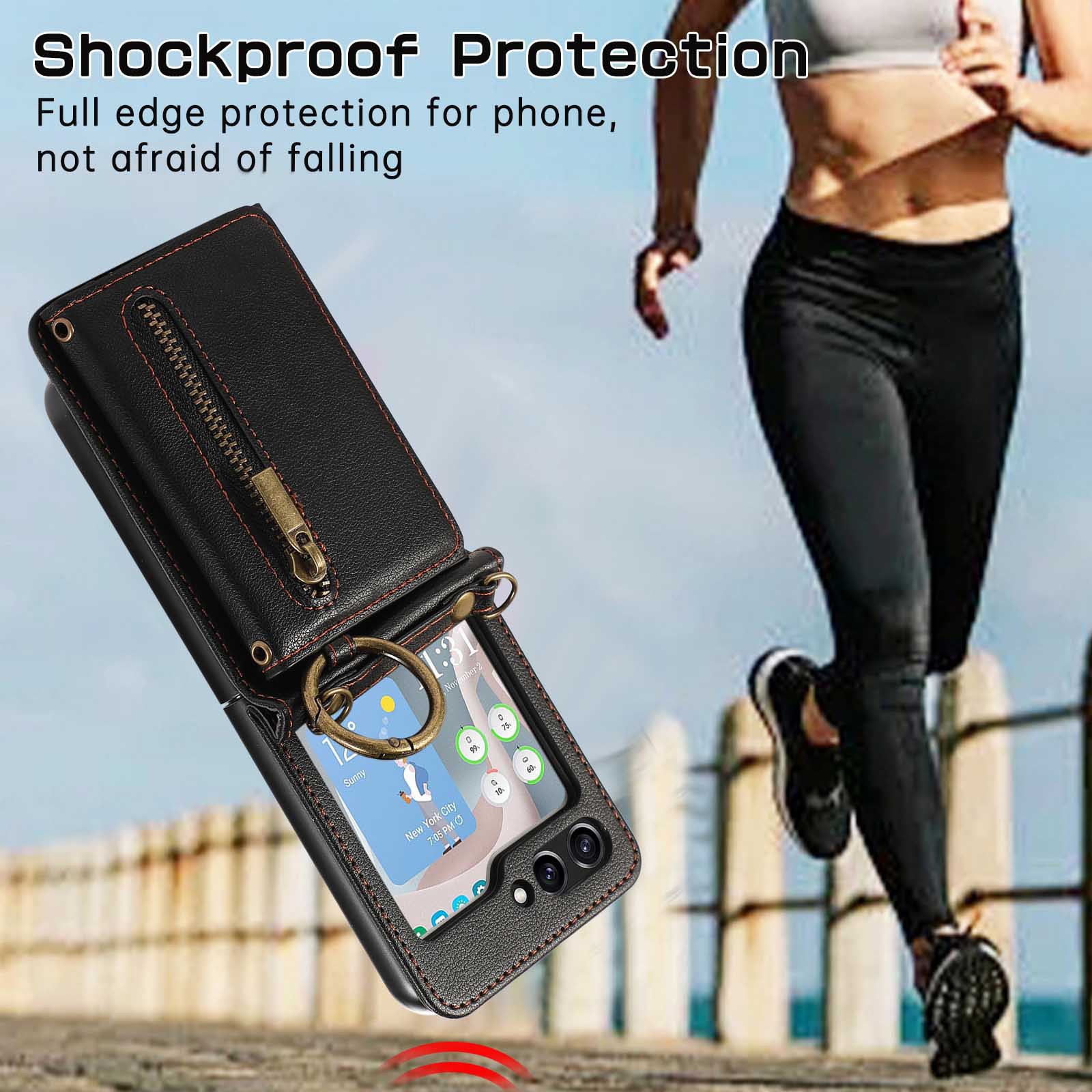Trifold card holder finger ring buckle crossbody lanyard zipper leather case mobile phone case