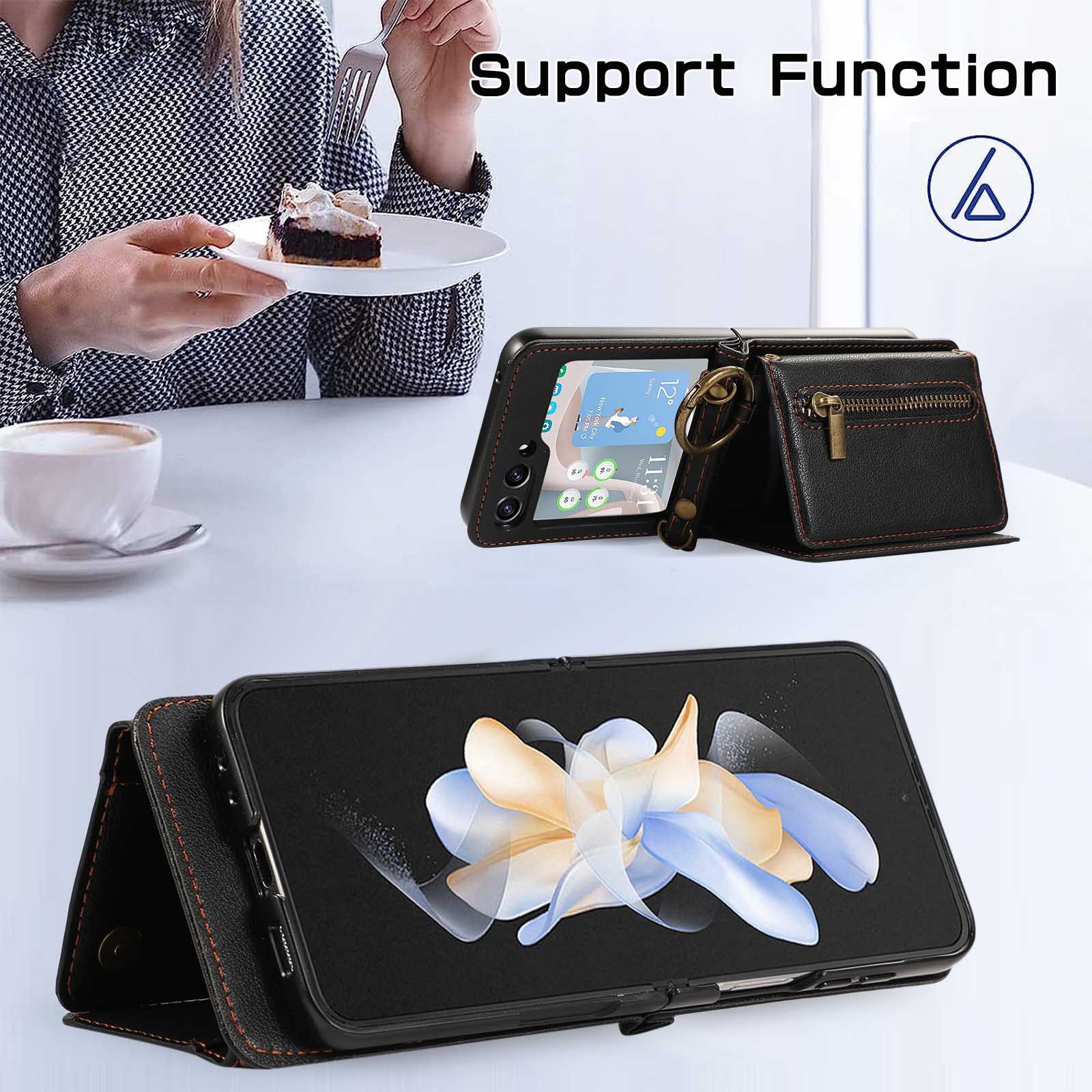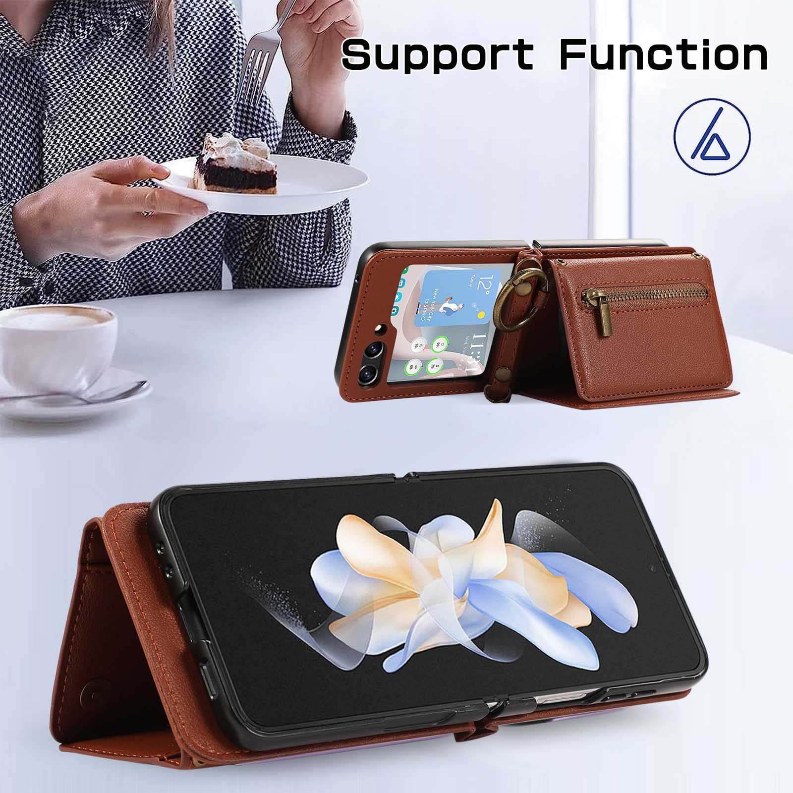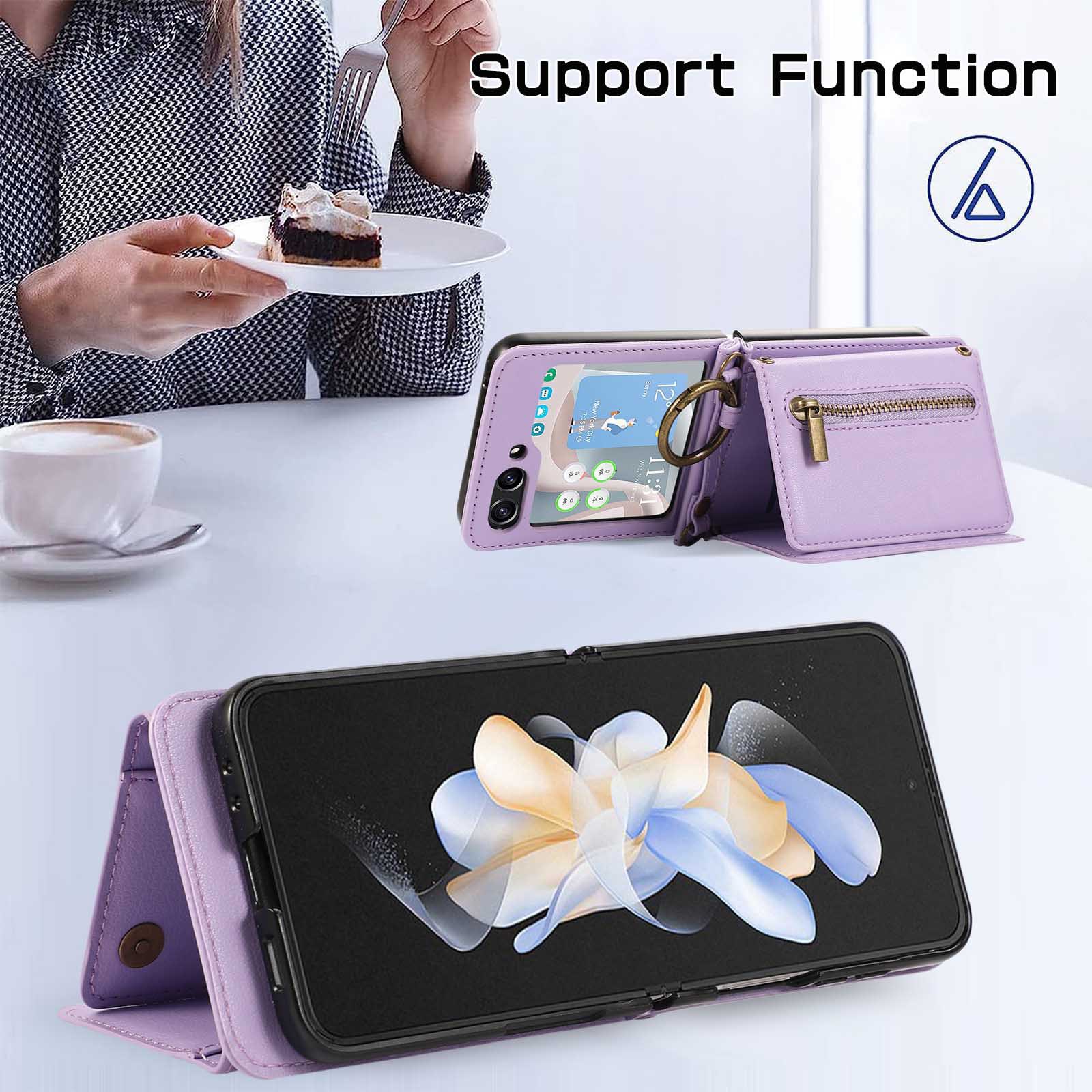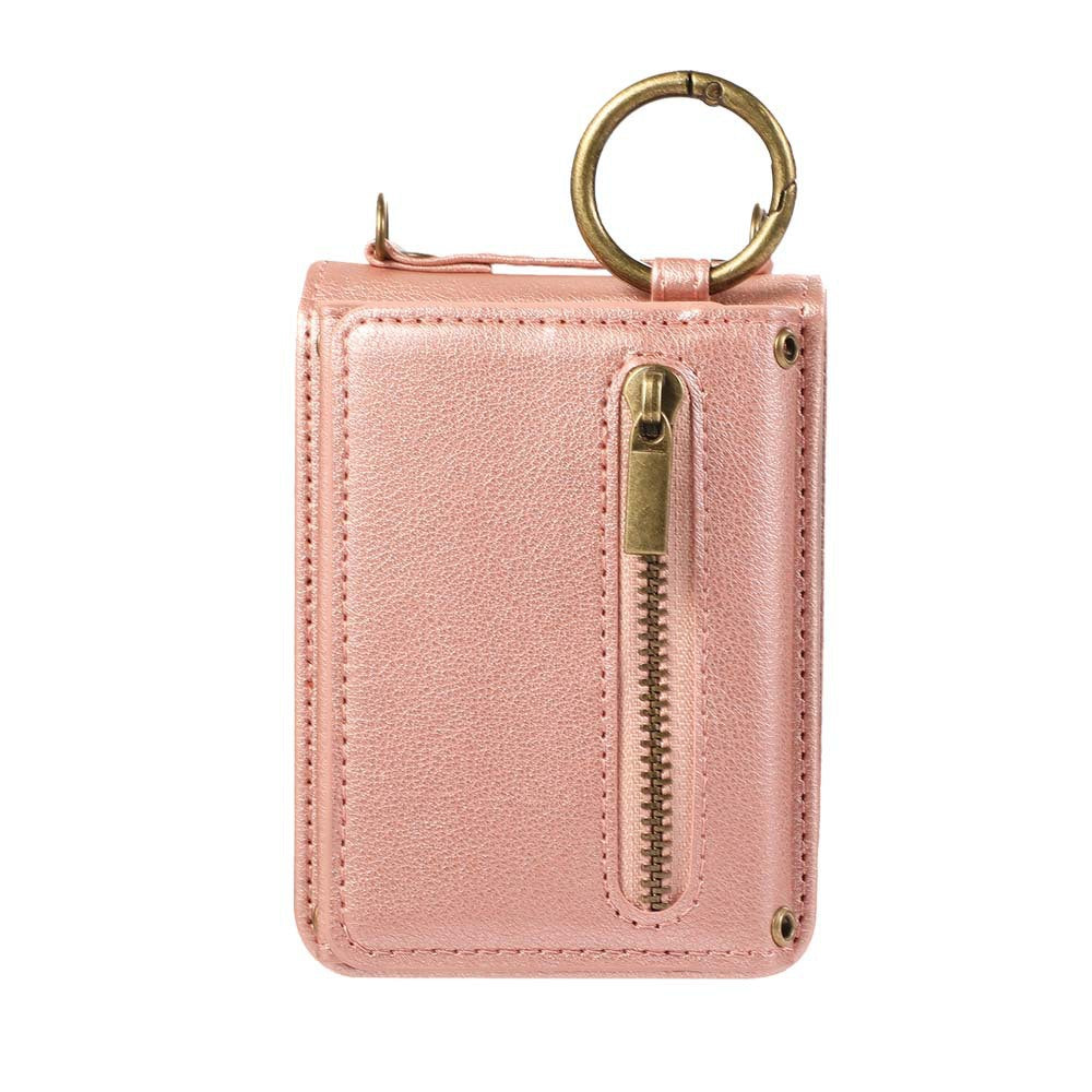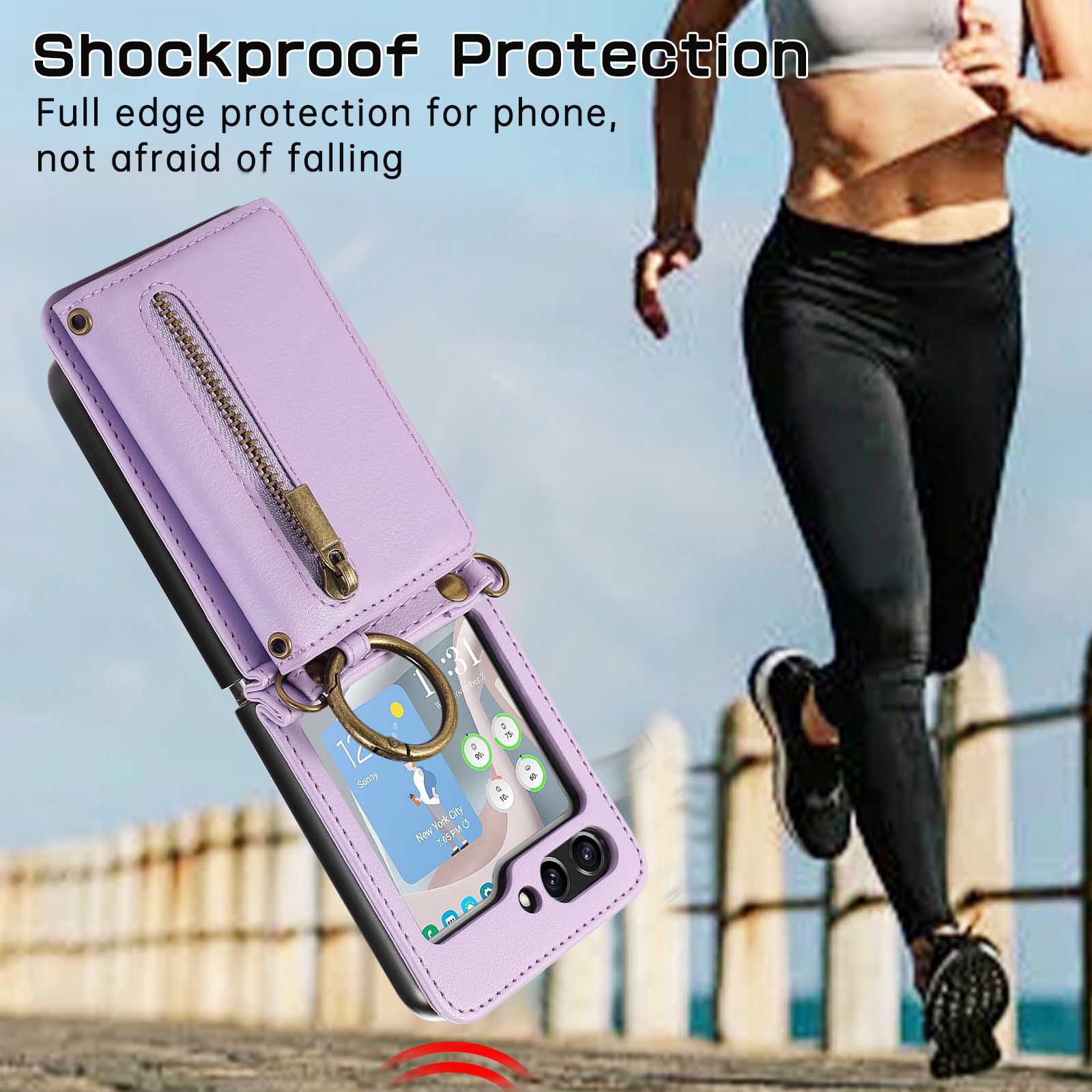Trifold card holder finger ring buckle crossbody lanyard zipper leather case mobile phone case